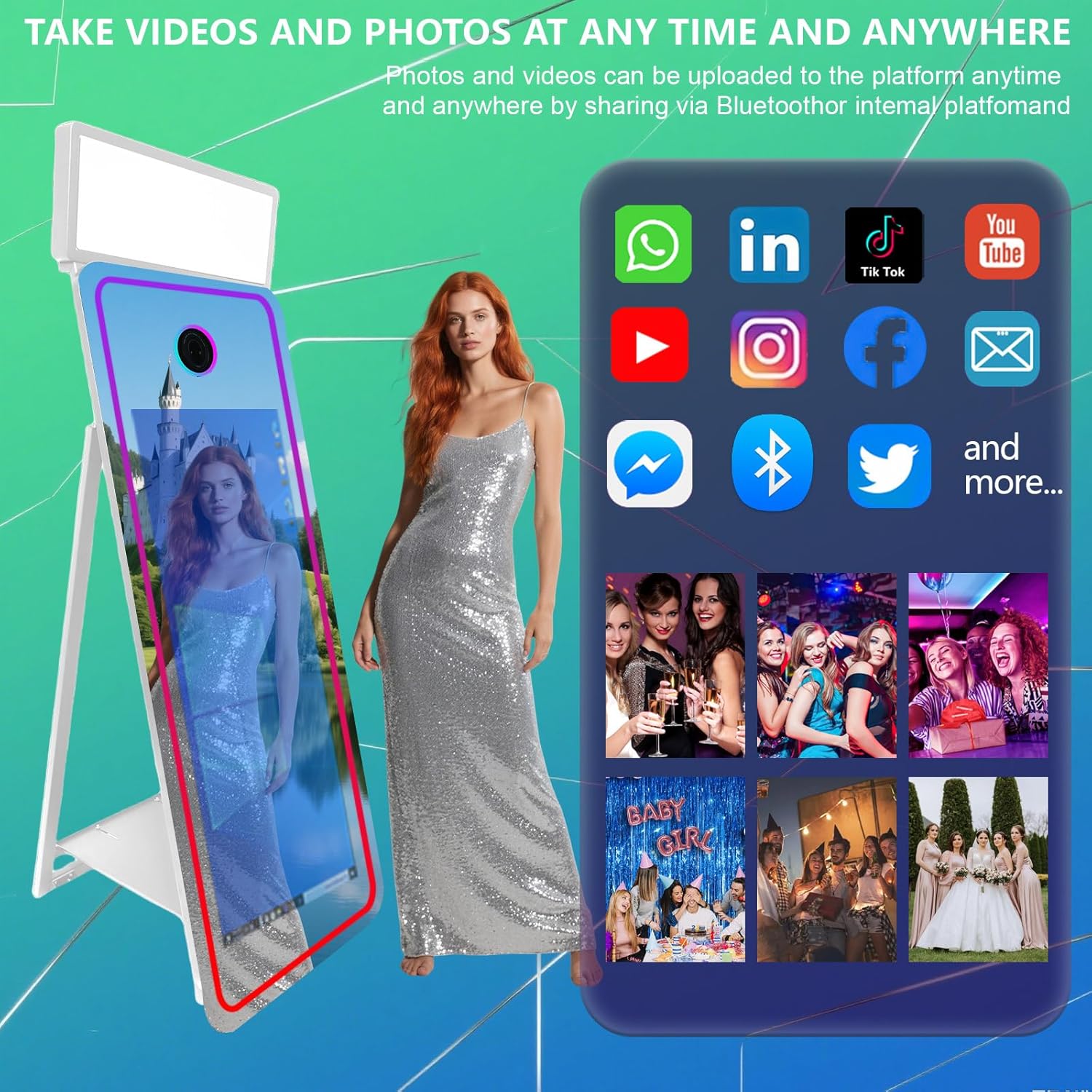 • HIGH-RESOLUTION TOUCH SCREEN: The Magic mirror photo booth machine comes 65'' mirror glass pane,Build-in mini PC(intel i5 8G+256G SSD) and Win10 system.The 43in touch screen is high-resolution display,can zoom in,zoom out,flip,slide etc on the screen and pictures,easy to operate