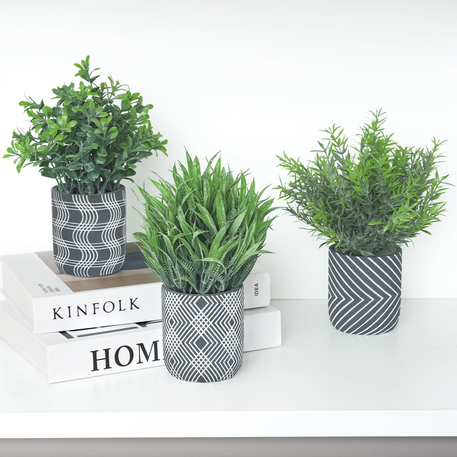 3 Pack Small Fake Plants, Fake Grass Plant, Artificial Boxwood & Rosemary with Geometric Pattern Cement Pots, Small Potted Faux Greenery for Home Decor, Bathroom, Office, Farmhouse Decoration
