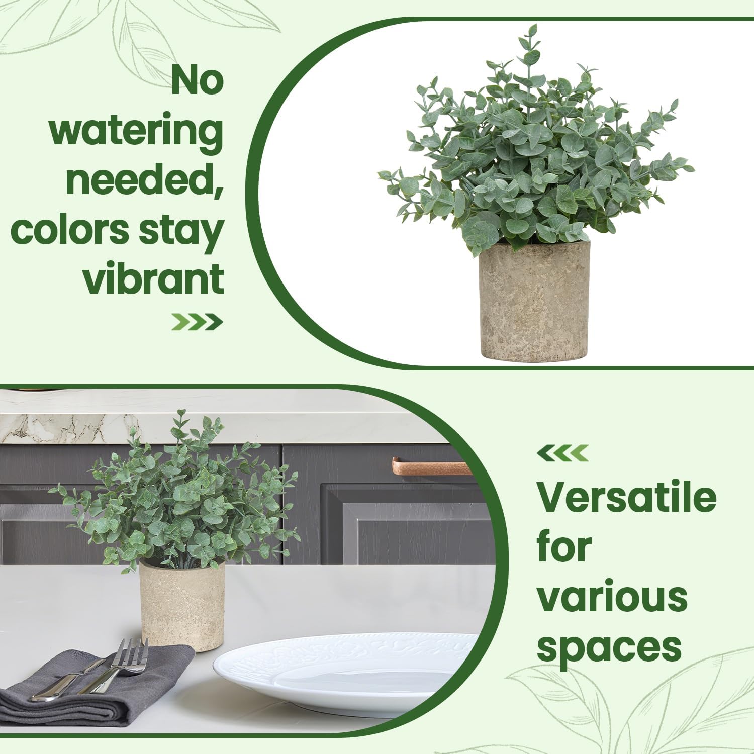 • Realistic Small Fake Plants: These small fake plants feature frosted eucalyptus leaves with clear textures, mimicking the natural appearance of real greenery. Carefully crafted with a soft sage green tone, some leaves show a delicate frosty-gray finish [which is not dust], enhancing their realistic and fresh look