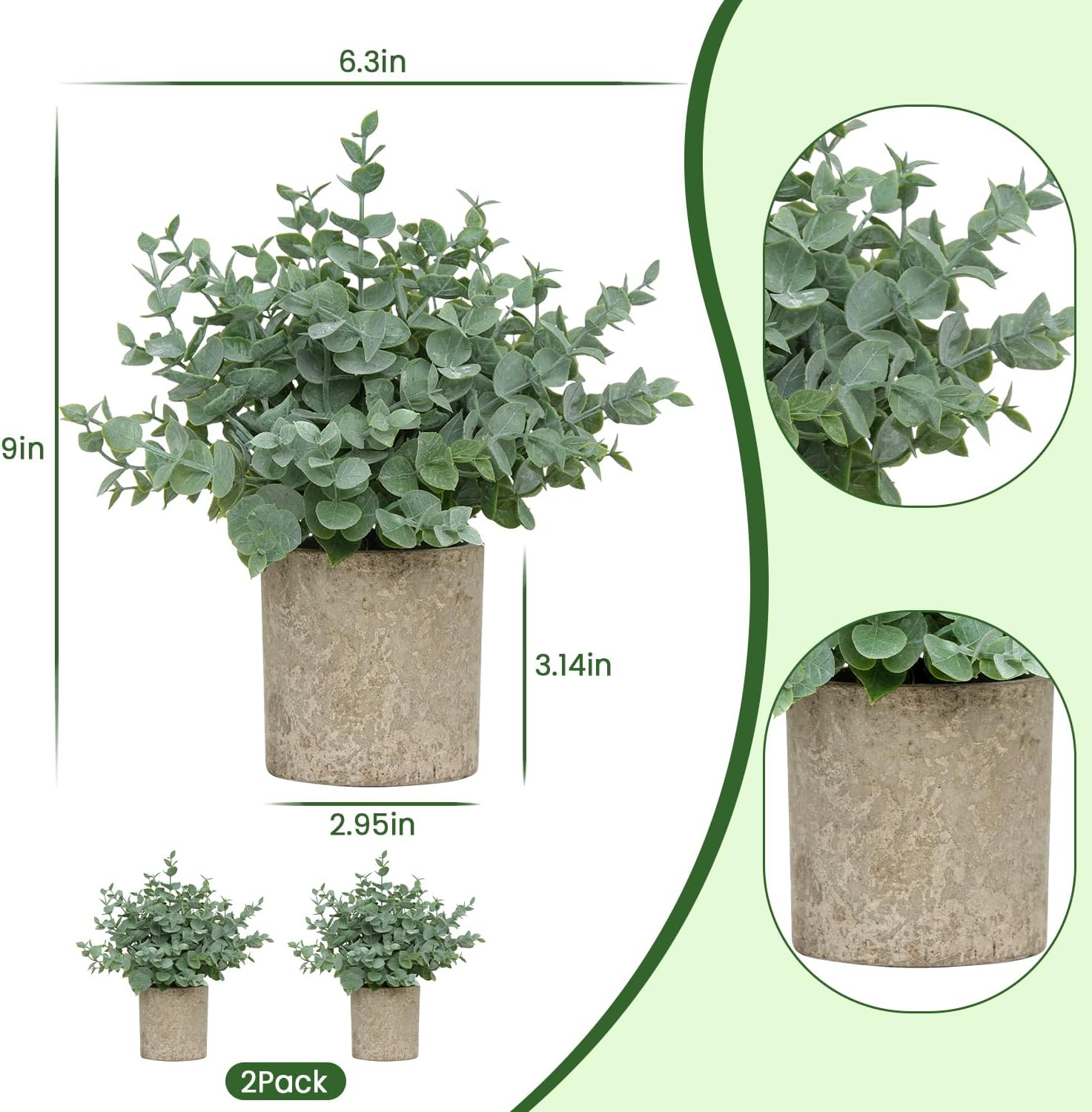 • Small Size & Adjustable Shape: This set includes 2 small artificial eucalyptus plants, each measuring approximately 9 inches in total height (from the top of the plant to the bottom of the pot) and 6.3 inches in width when the leaves are fully spread. The gray paper pulp pots are about 2.95 inches wide and 3.1 inches tall. You can gently adjust the leaves to achieve your desired shape and fullness. NOTE: The leaves may be slightly compressed during shipping — simply reshape them by hand to restore their natural appearance