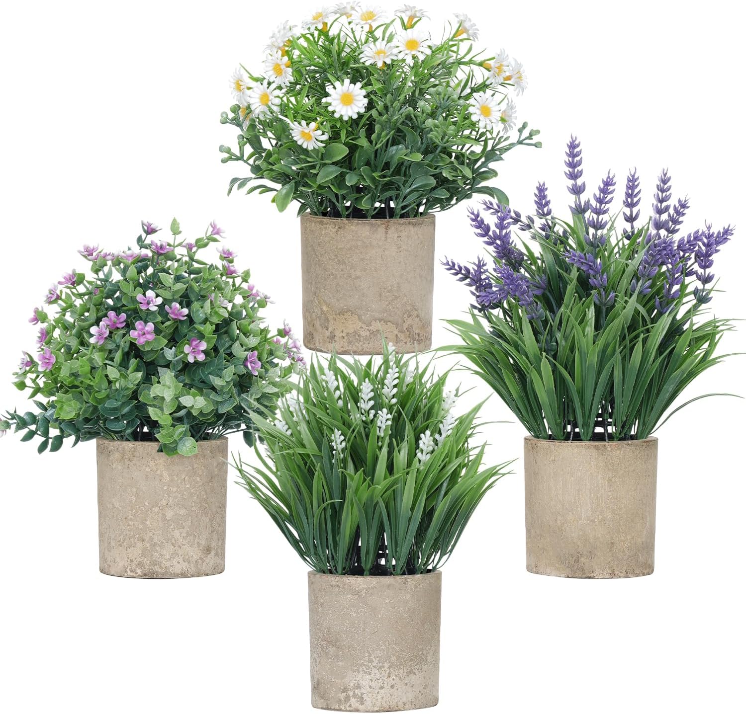 4 Pack Small Fake Plants, Artificial Eucalyptus Leaves with Flowers, Lavender & Daisy with Gray Paper Pulp Pots, Small Faux Potted Plant with Flowers for Home Decor, Indoor&Outdoor Decoration