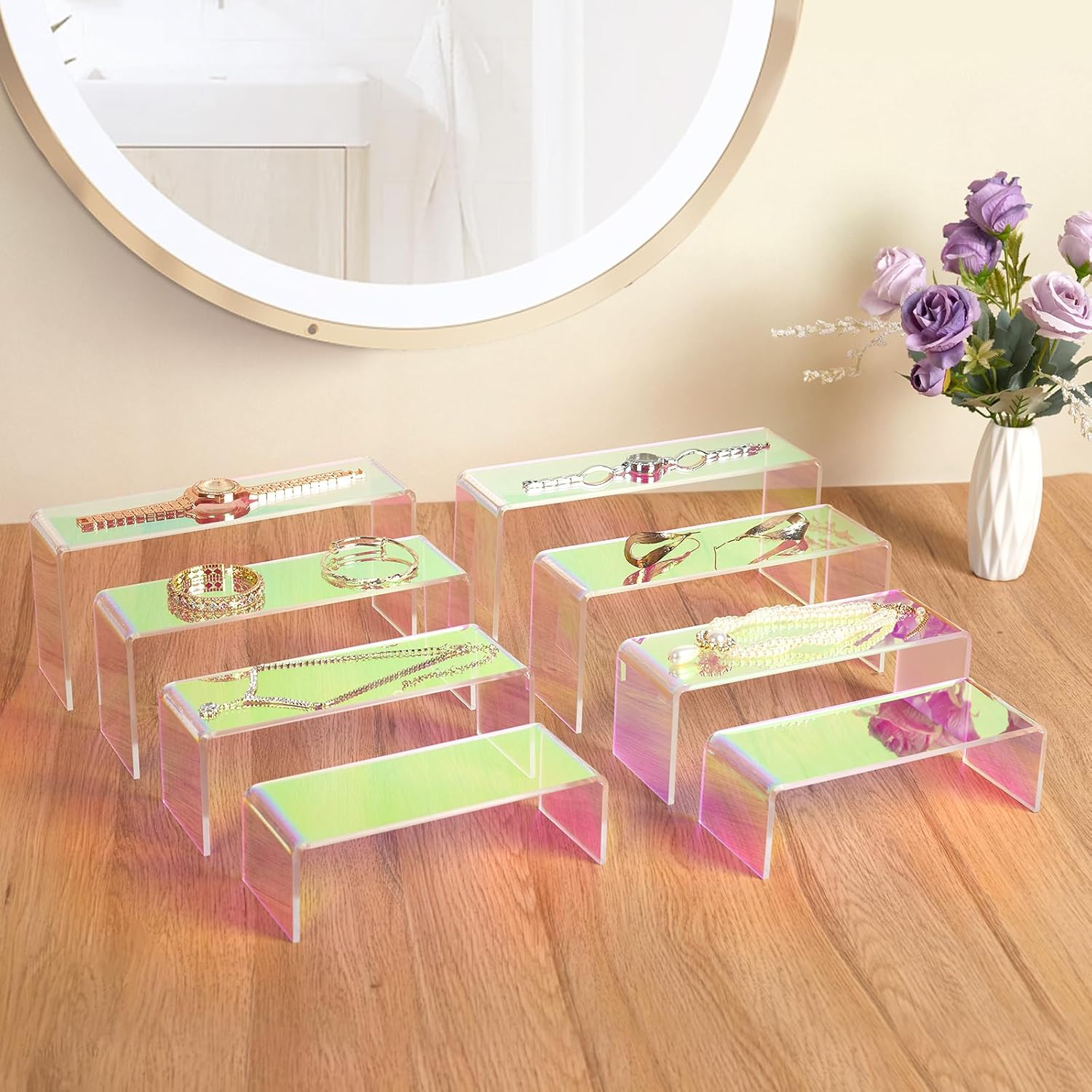 Iridescent Acrylic Display Risers, 8pcs Rainbow Display Stand Rectangular Stands Showcase Transparent Display Shelf for Dessert Cupcake Collectibles Figures Jewelry Perfume (Iridescent-8pcs)