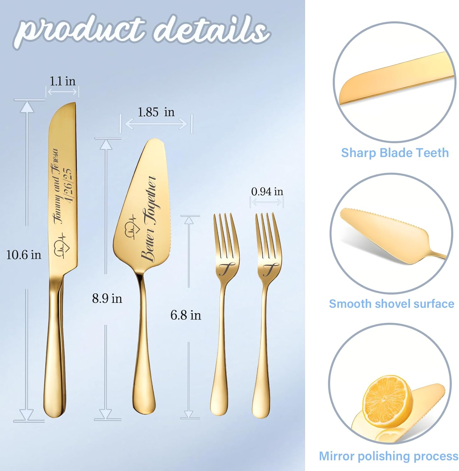 Personalized Wedding Cake Knife and Server Set, Custom Names Cake Cutting Set with Stainless Steel Forks, Customized Bridal Anniversary Birthday Wedding Registry Gifts for Couple (Gold)