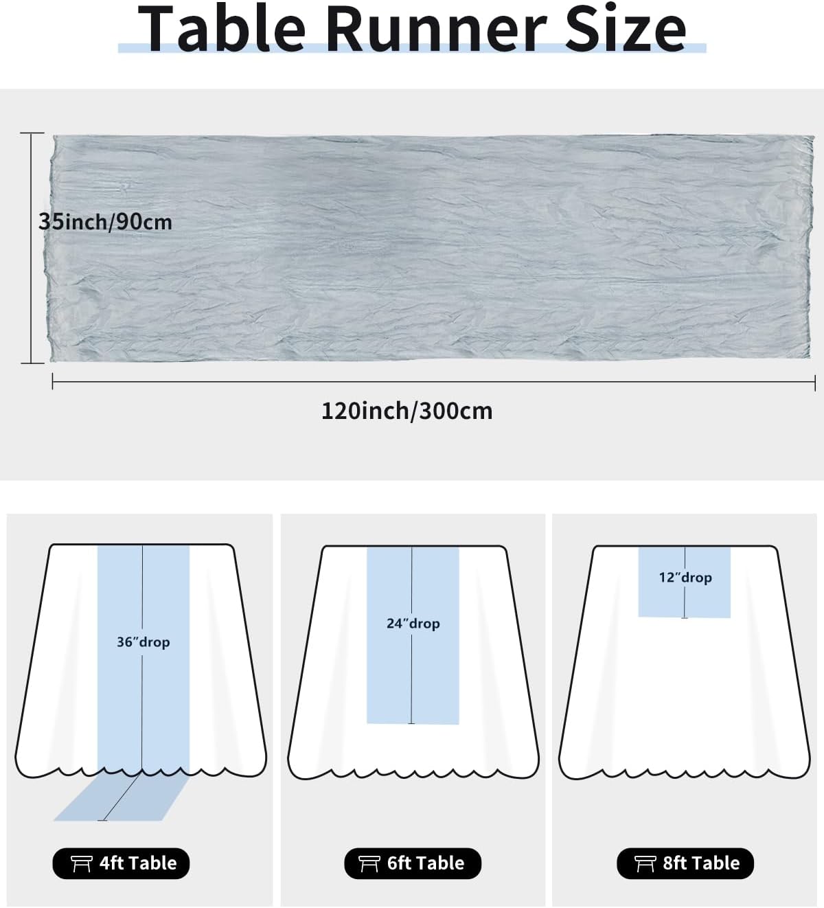 • Package : 1 dusty blue cheesecloth table runner (35” W x 120” L / 10 FT). Perfect for 6ft/8ft round or rectangular tables seating 8-10 people; can be used for long tables. It's also a great choice for decorating wedding arches and chairs.