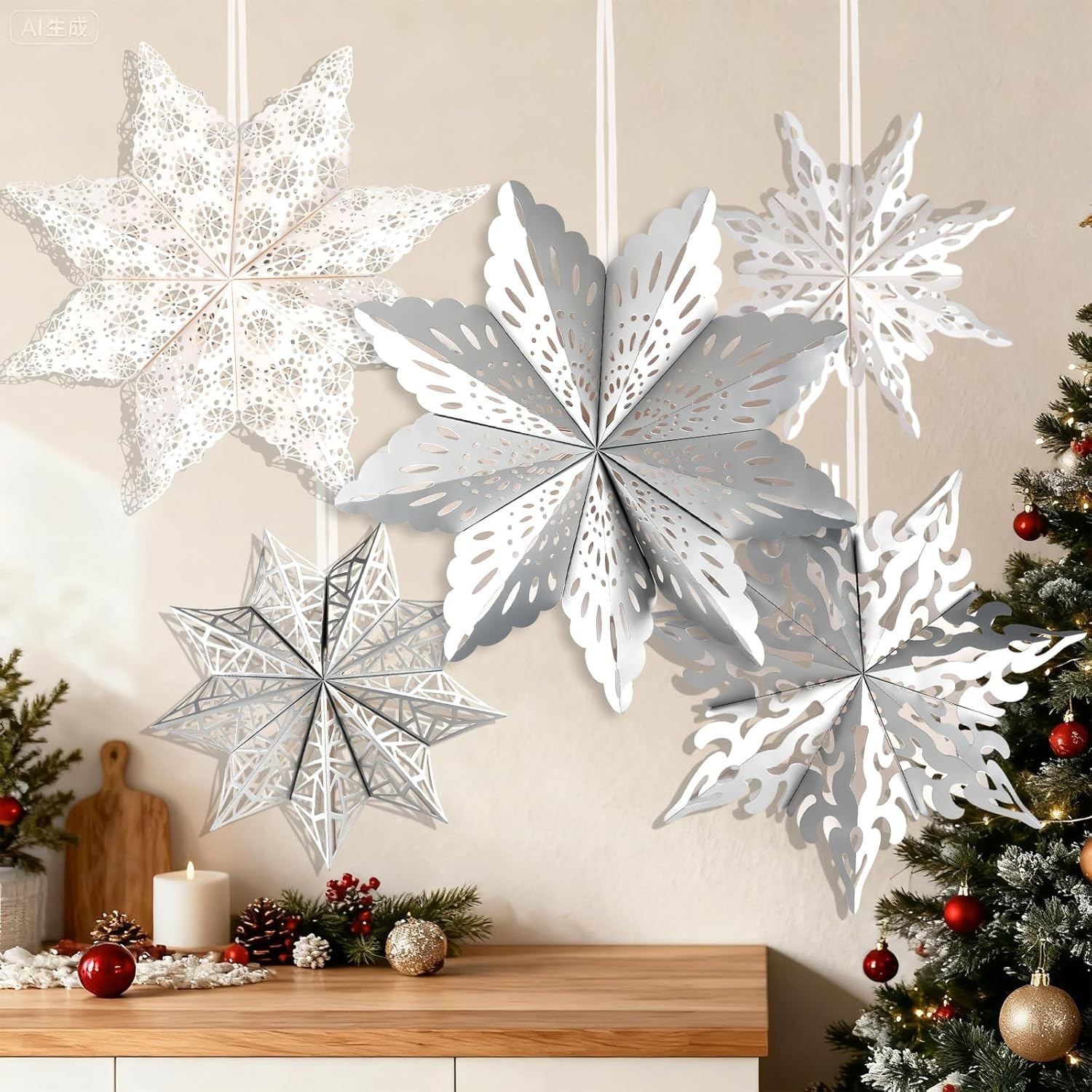 • Unique Snowflake Designs: This Christmas paper snowflake lanterns set includes 5pcs led lights and a remote control,3pcs silver paper snowflake lanterns, 2pcs white paper snowflake lanterns, each beautifully crafted with intricate hollow out cutout designs. Measuring 14 to 18 inches, these eye-catching hanging christmas decorations add a magical winter touch to your holiday décor