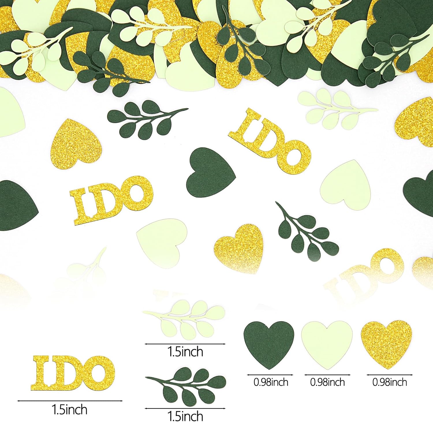 • 5.Proper Size and Premium Material.The heart confettis width 0.98inch,the sage leaves 1.5inch width,the I do letter 1.5inch width,looks perfect with premium fresh color papercard,adding a warm and energetic sense to your party table decorations.