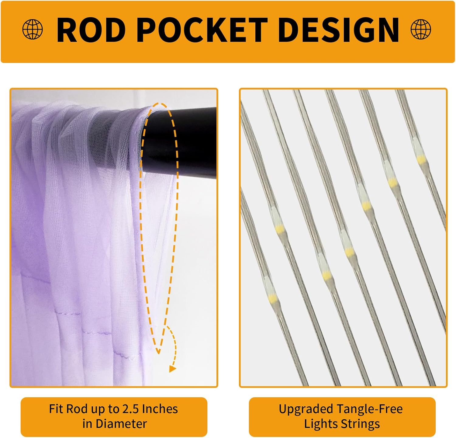 • Elegant Combination of Tulle Backdrop Curtains and Lights - Package Includes: 2 panels lavender sheer tulle backdrop curtains (5ft x8ft each, total 10x8ft).1 set of a 10x8.2ft warm white USB-powered tangle-free string lights (10 strands with 250 LEDs). 12 Transparent clips for hassle-free Installation. (Pro Tip: Buy multiple sets for fuller coverage and reduced sheerness!)