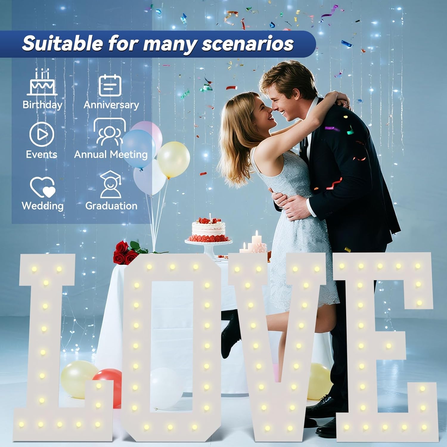 • 【Battery Powered Marquee Letters】: Marquee Letters sign designed with warm white led lights, powered by 3 AA batteries(not included) is an eye catching centerpiece for Birthday Party, Wedding, Gender Reveal Party, Proposal, Grad Party, Engagement party and any event etc