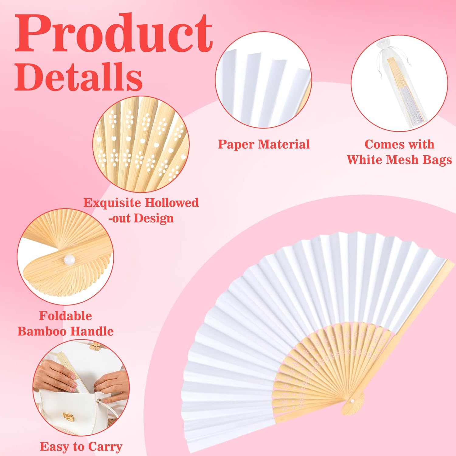 • Material: Folding handheld fans is made of paper material, exquisite hollowed-out handle is made of natural bamboo