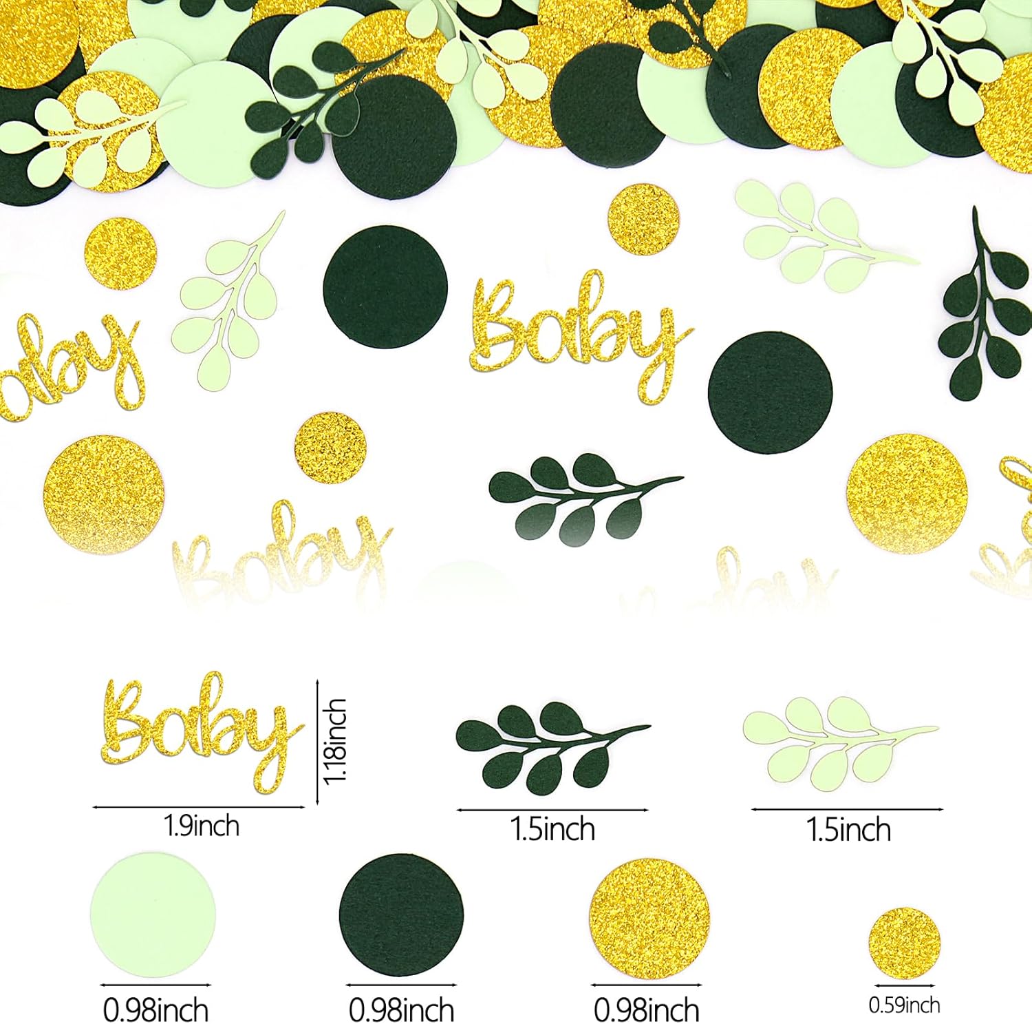 • 1.The greenery baby shower confetti package include:300pcs total,there are 3designs round circles sage leaves and “baby” letters in 3 colors(glitter gold/light green/dark green/),looks fresh and full of vigor.
