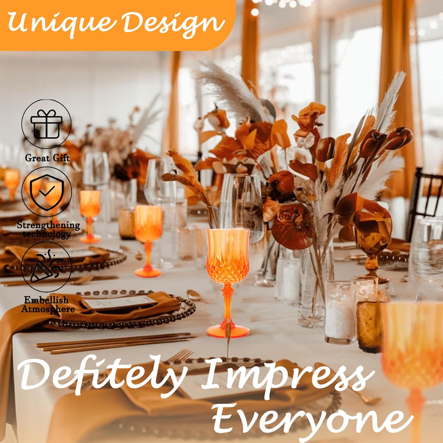 • 🍷🍷🍷【Product Description】 This set includes 24 retro-style pumpkin orange party plastic wine glasses, providing ample quantity to meet your daily use and replacement needs. The elegant and sophisticated design makes your wedding reception unique