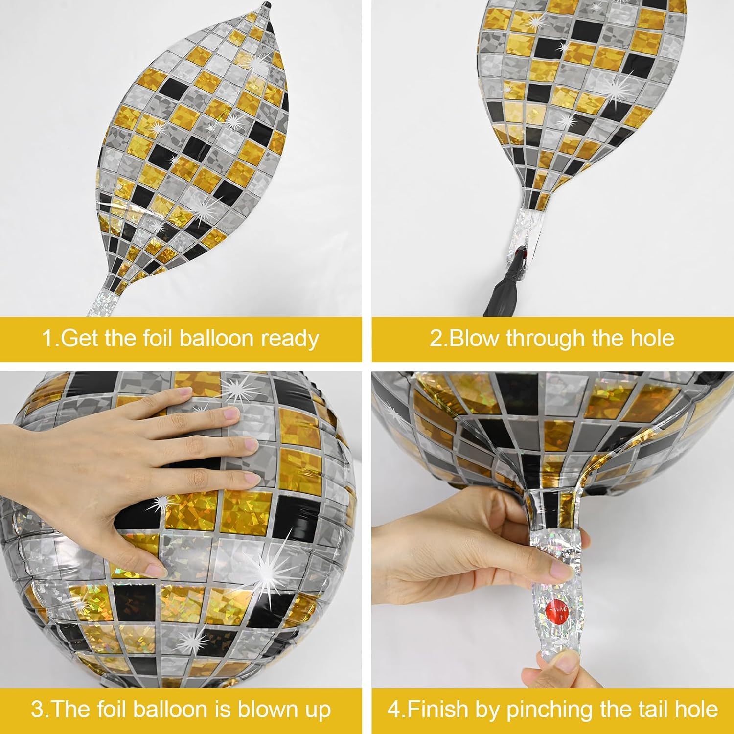 • EASY TO USE:These black gold silver disco ball decorations balloons can be filled with air or helium.pinch the inflation port of the disco balloon to seal it.the set comes with a straw and ribbon,after the party is over,use the straw to deflate by inserting it into the inflation port,balloons can be reused