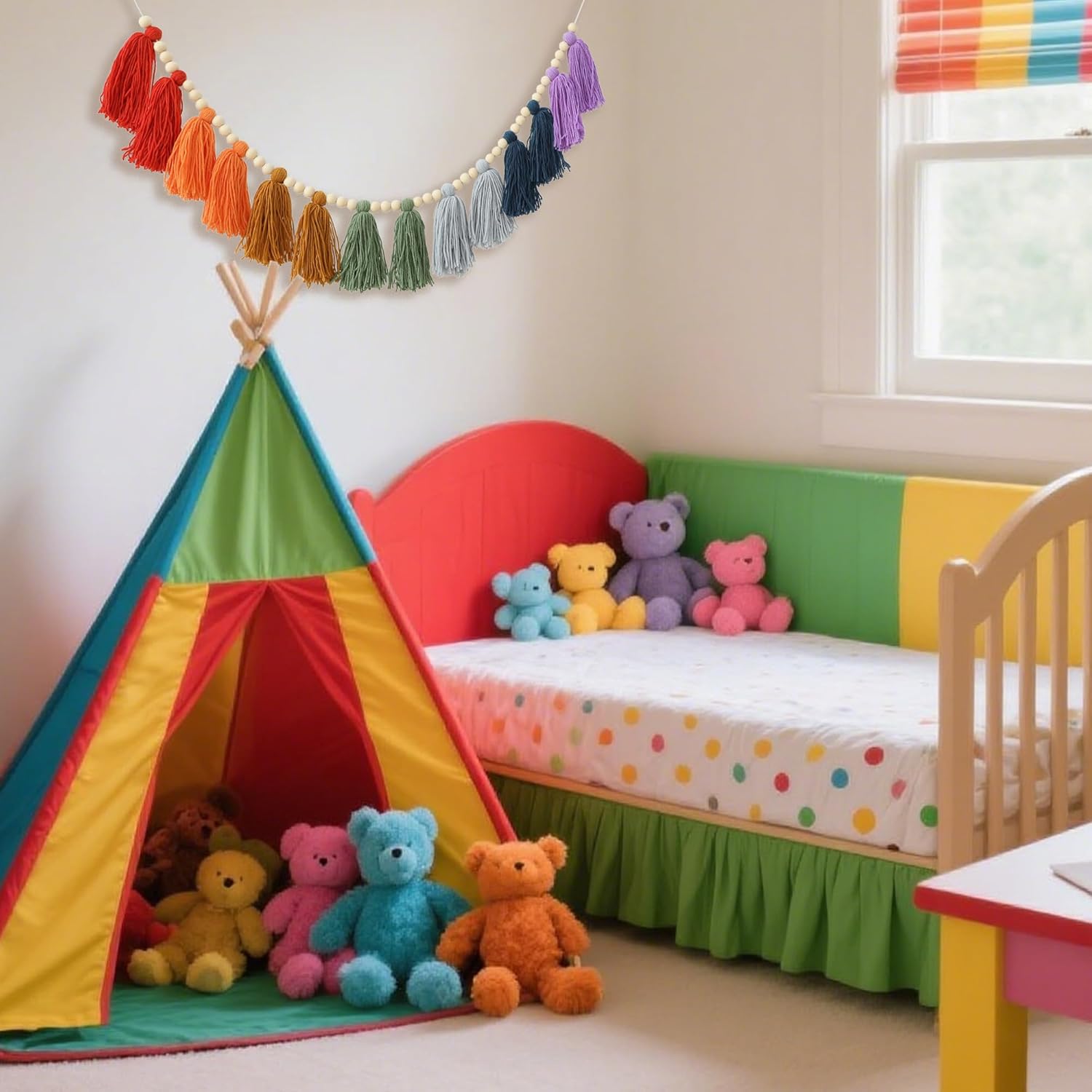 Boho Tassel Garland Wall Hanging with Wood Beads Colorful Tassel for Kids Room Bedroom Classroom Nursery Dorm Decorations
