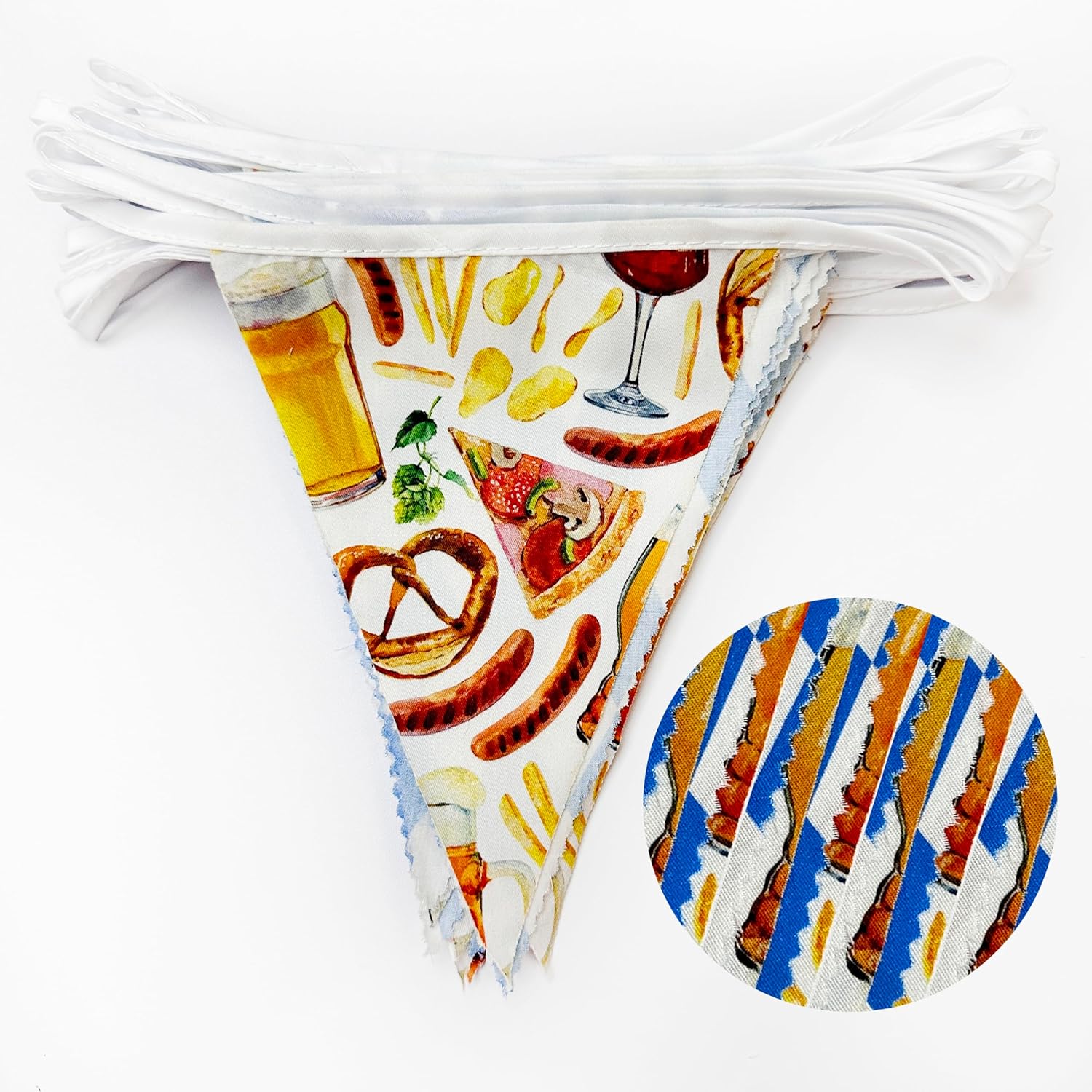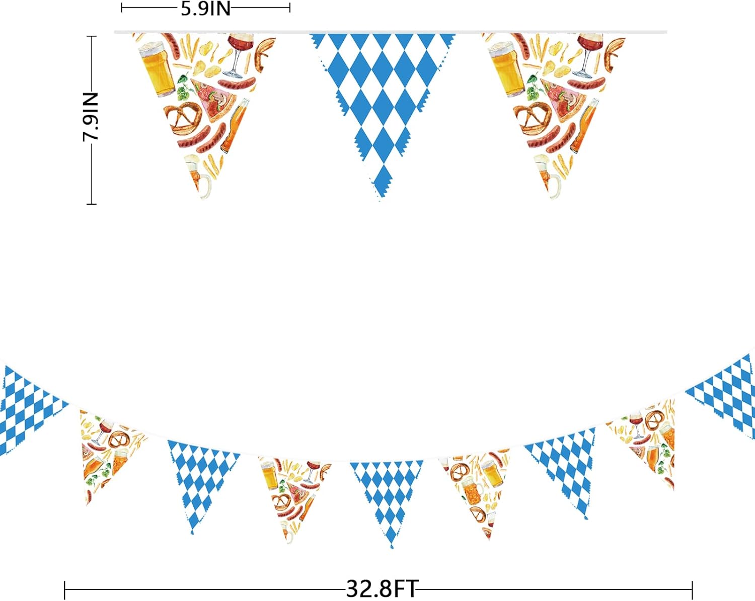 • Package Including:1 pack oktoberfest bavarian theme fabric bunting banner garland in blue white checkered and German beer festival elements printed colors, with 36pcs flags in 10M/32.8Feet. Flag Size: 5.5in width x 7in height.