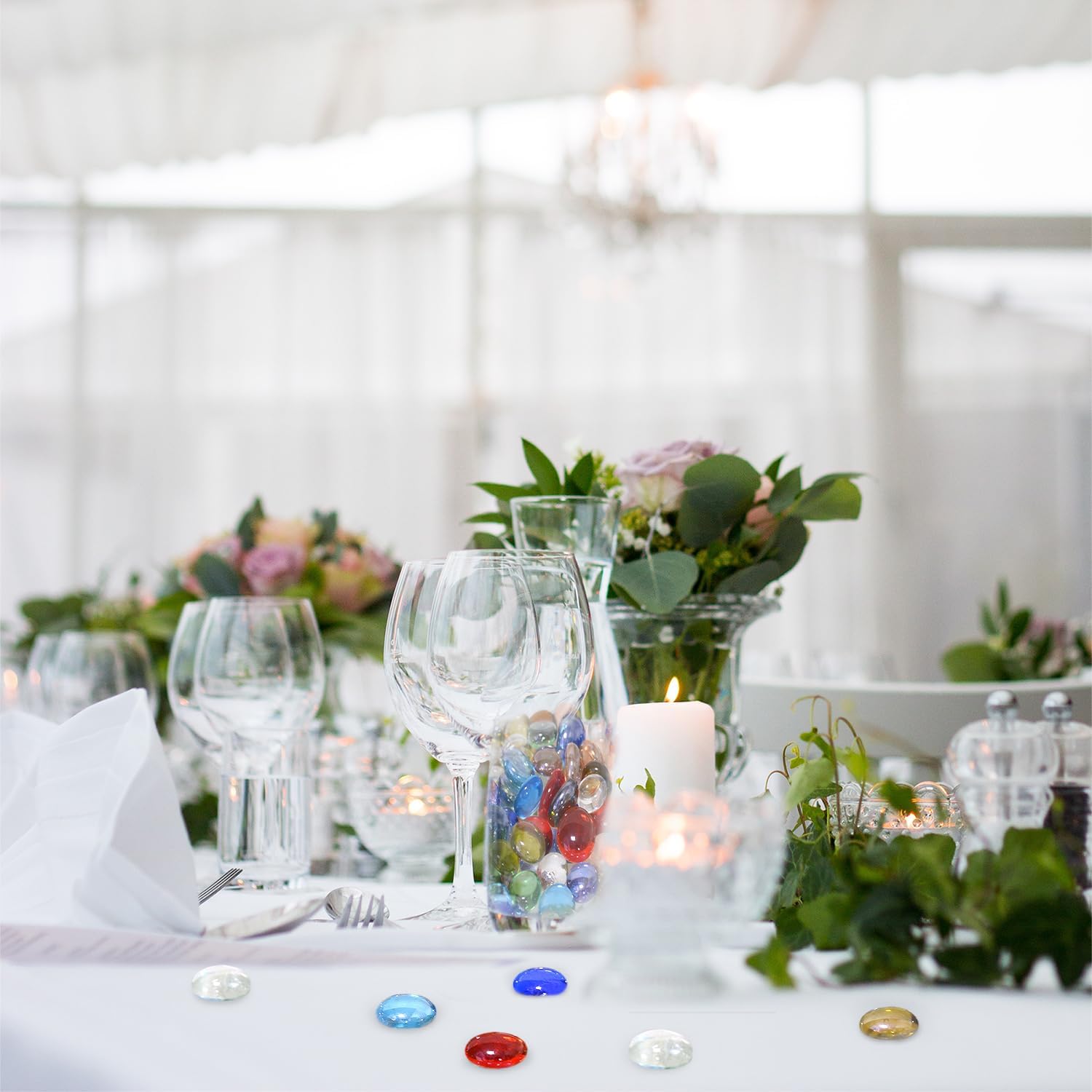 • * The flat glass beads have wide applications, they can be used as fish tank decoration, vase filler, props, table scatter, craft, home décor, fire drops and more.
