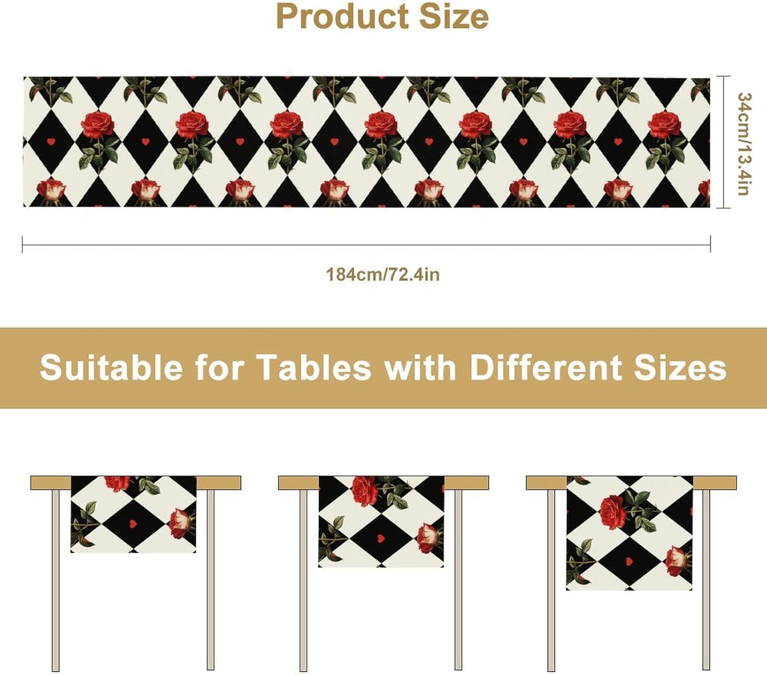 Vintage Rose Table Runner, Red Rose Hearts Black White Checkered Background Table Runner for Kitchen Dinning Table Runner Decor Home Wedding Party Holiday, 13x90 Inch