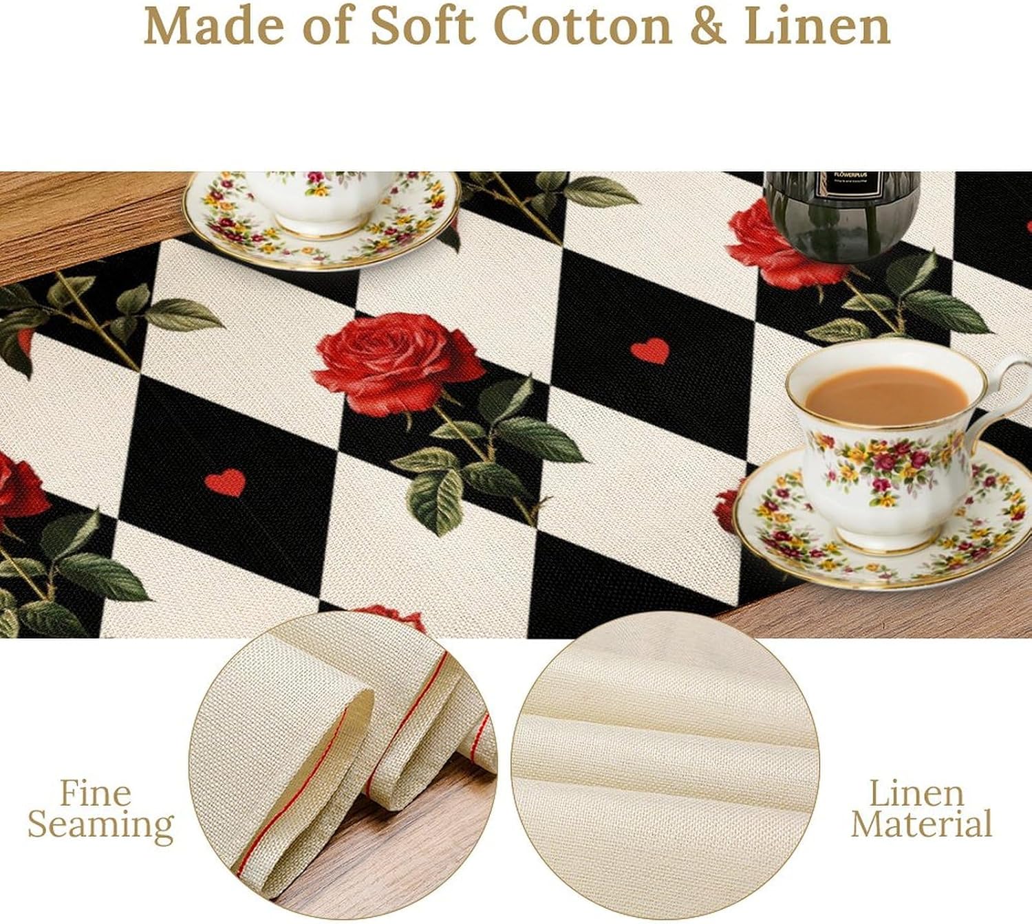 Vintage Rose Table Runner, Red Rose Hearts Black White Checkered Background Table Runner for Kitchen Dinning Table Runner Decor Home Wedding Party Holiday, 13x108 Inch
