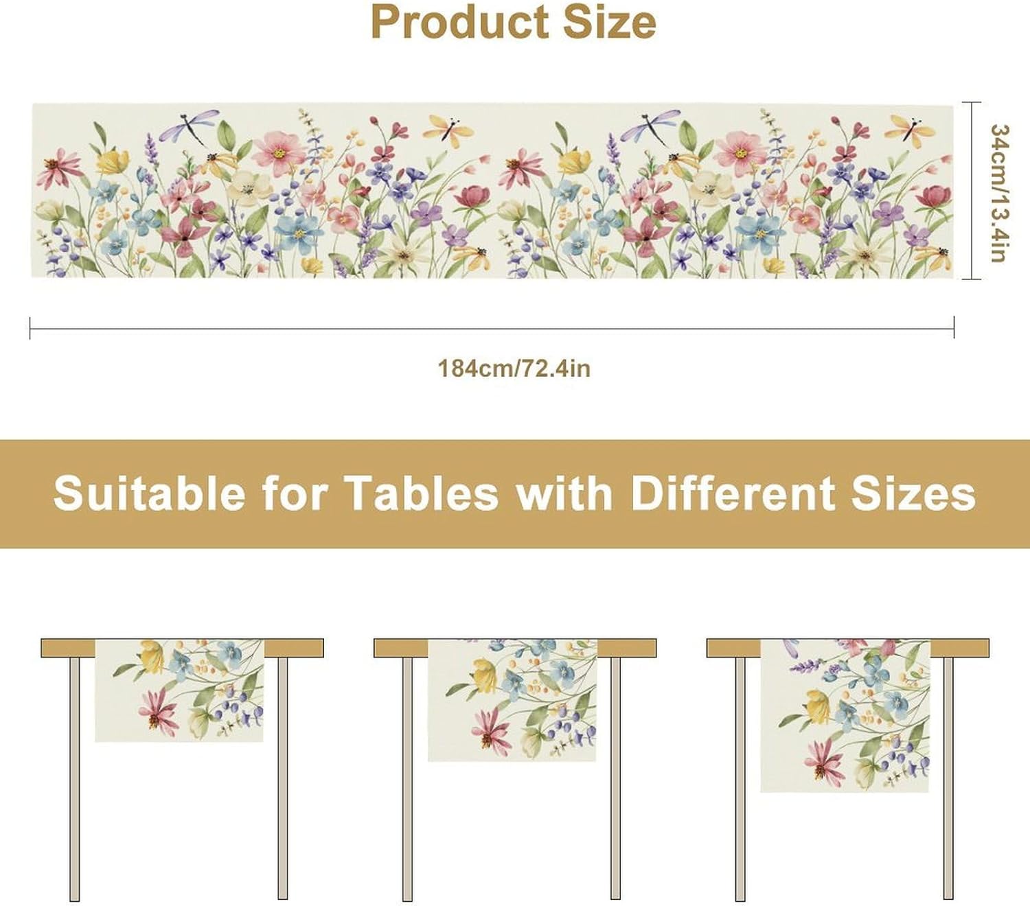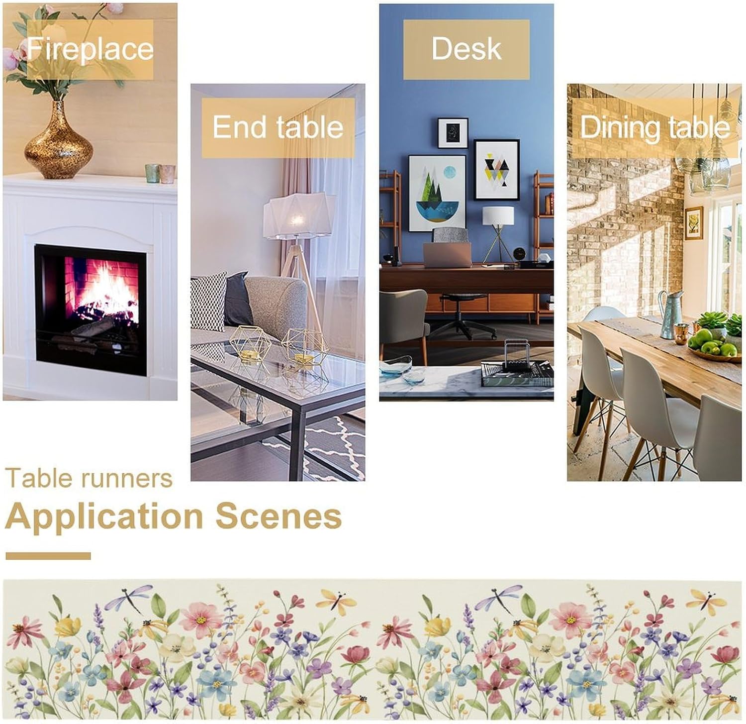 Watercolor Floral Table Runner, Colorful Spring Summer Nature Flower Dragonfly Pattern Print Table Runner for Kitchen Dinning Table Runner Decor Home Wedding Party Holiday, 13x120 Inch