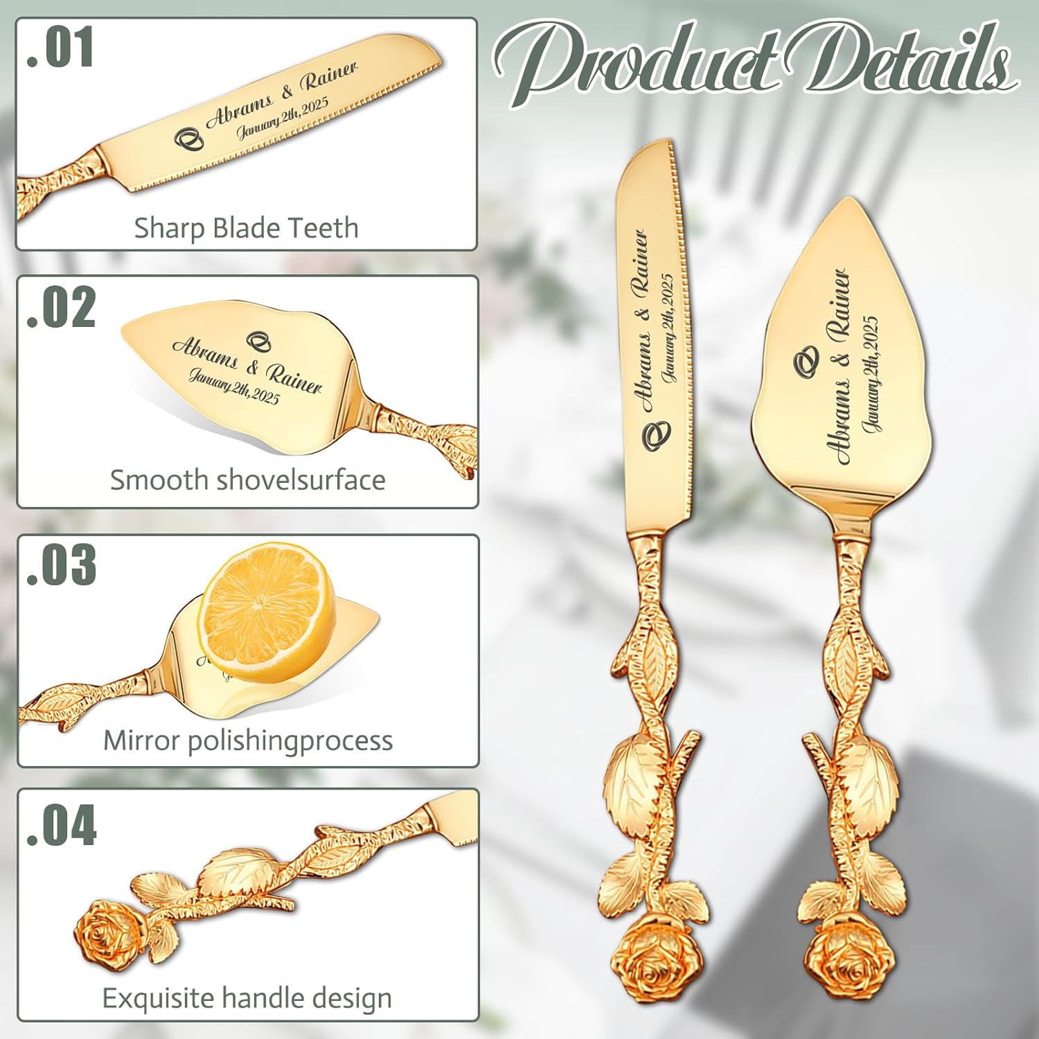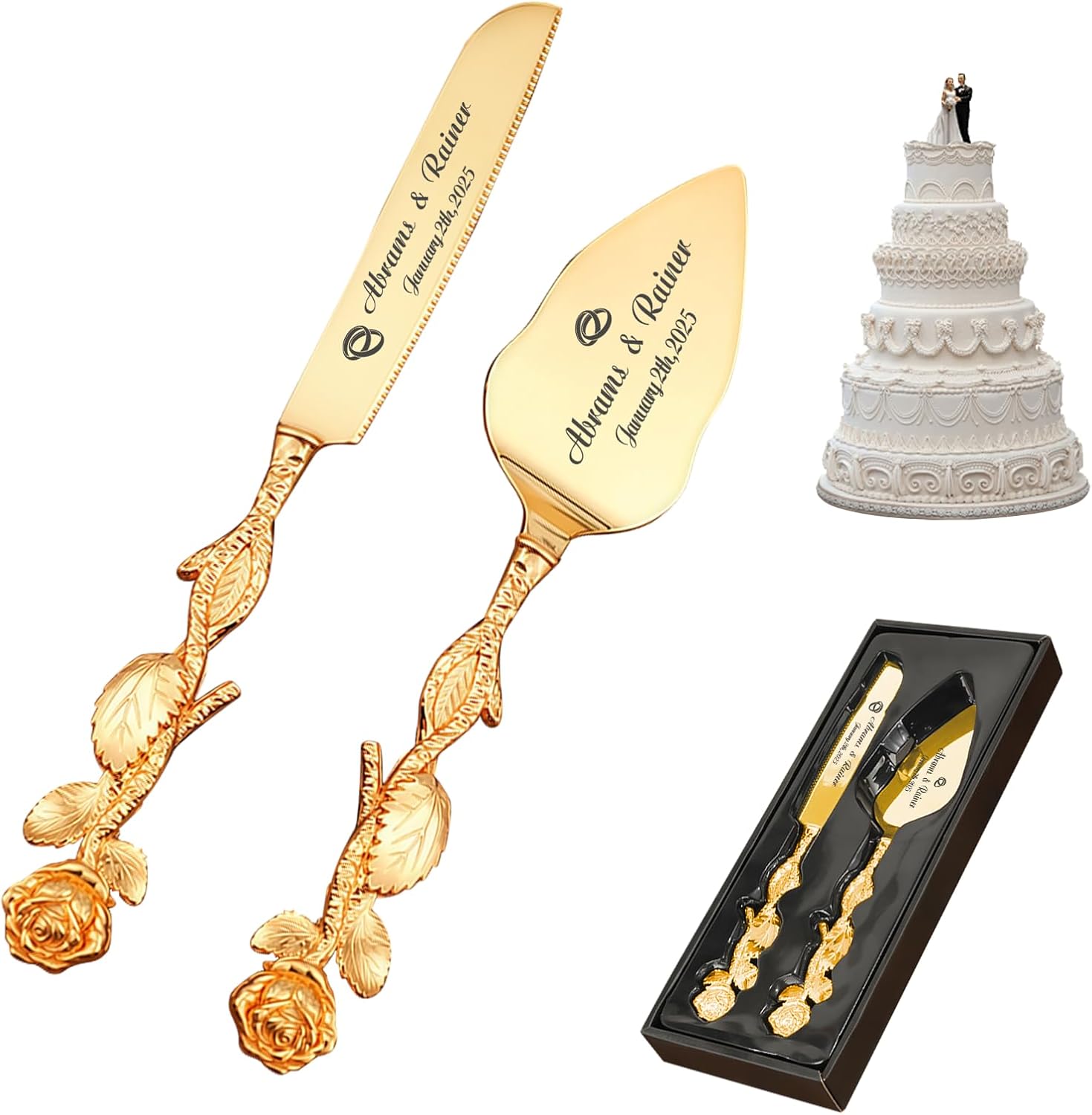 • Personalized Wedding Cake Cutting Set : Personalize the cake knife and server with names, dates,transforming them into a one-of-a-kind keepsake. The precision engraving turning your cake-cutting ceremony into a moment to cherish for a lifetime