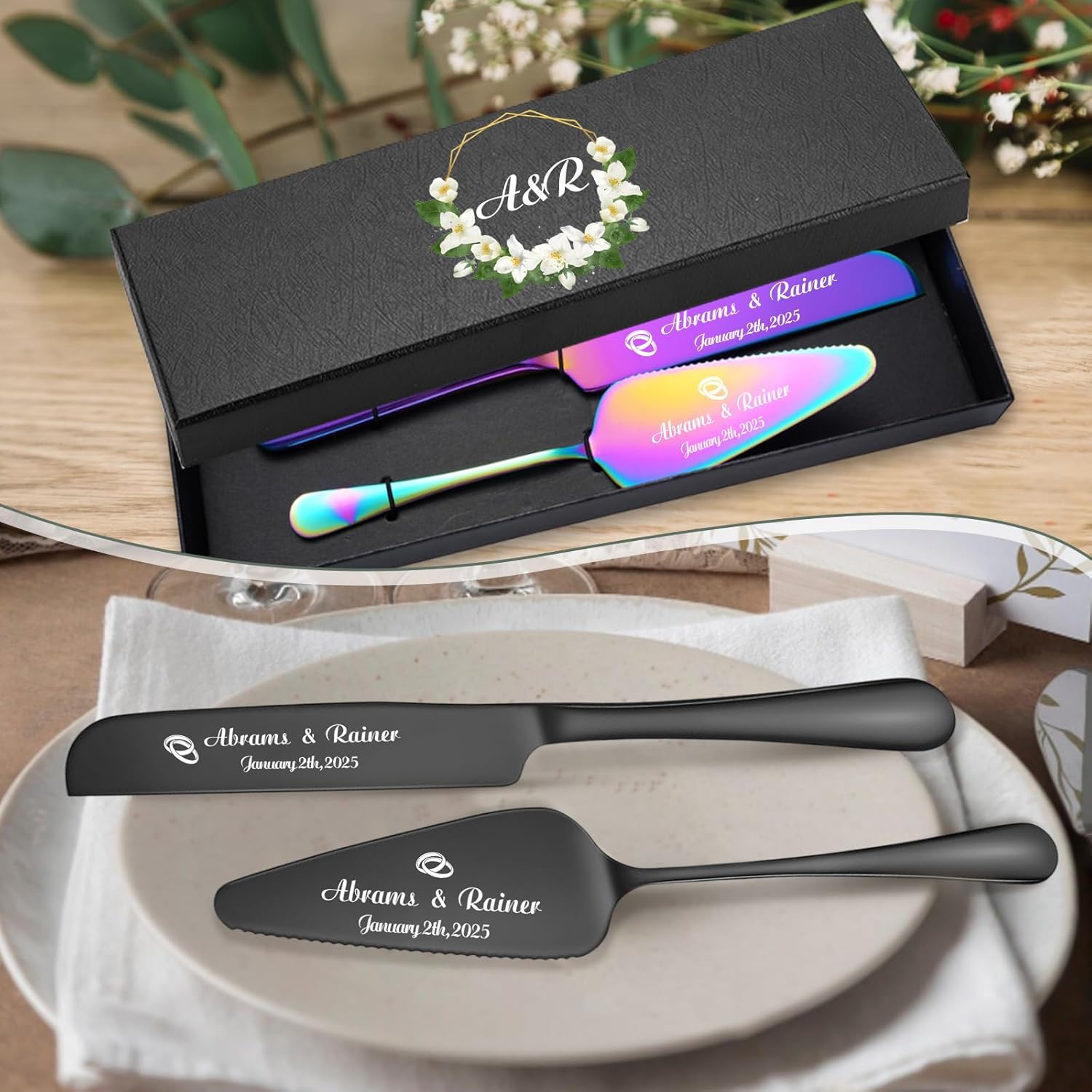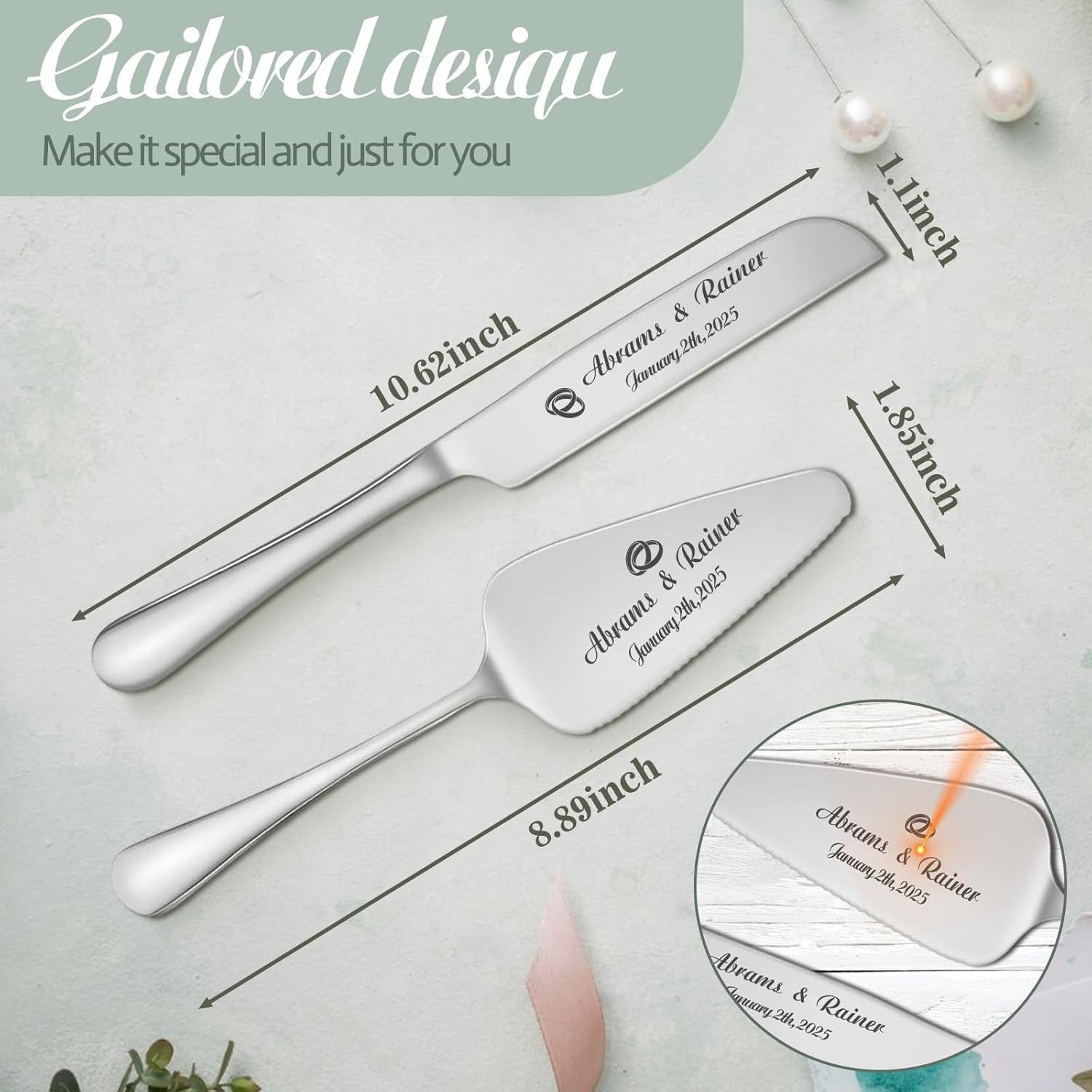 • Personalized Wedding Cake Cutting Set : Personalize the cake knife and server with names, dates,transforming them into a one-of-a-kind keepsake. The precision engraving turning your cake-cutting ceremony into a moment to cherish for a lifetime