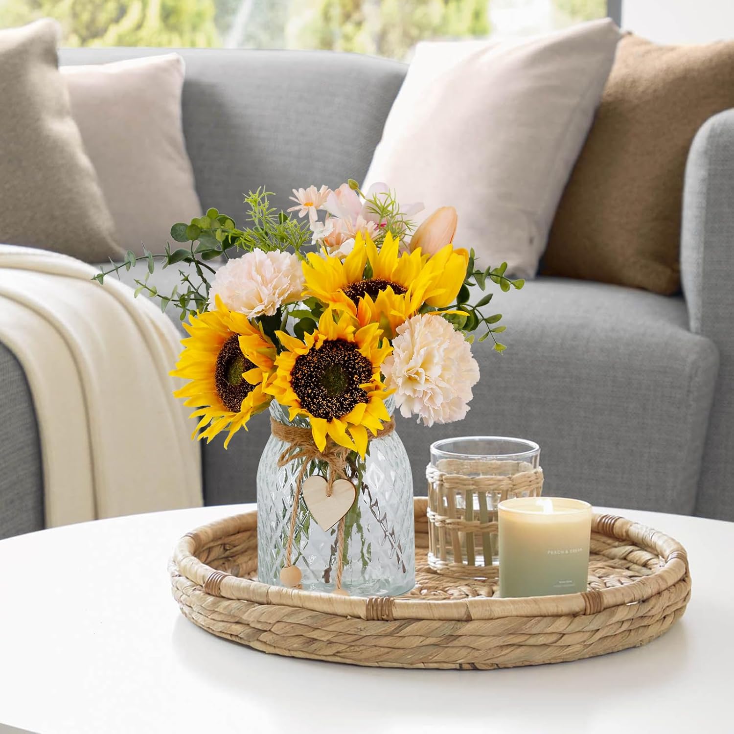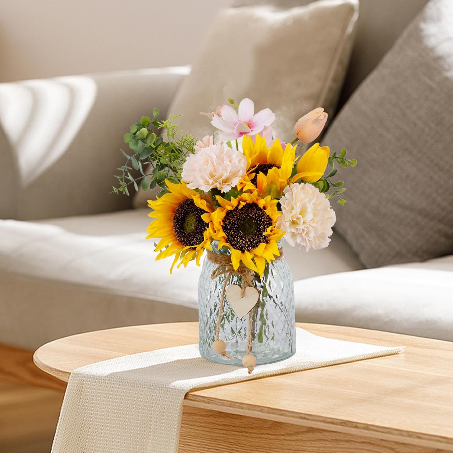 • LEFTOVER's Fake Flowers in Vase:Artificial silk sunflowers Bouquet in Vase includes 3 sunflowers ,2 carnations and 2 tulip, as well as some plants and small flowers,and a glass vase with a heart,ball pendant,twine and flower arrangement holder.Perfect for coffee table centerpiece and dining table centerpiece decor