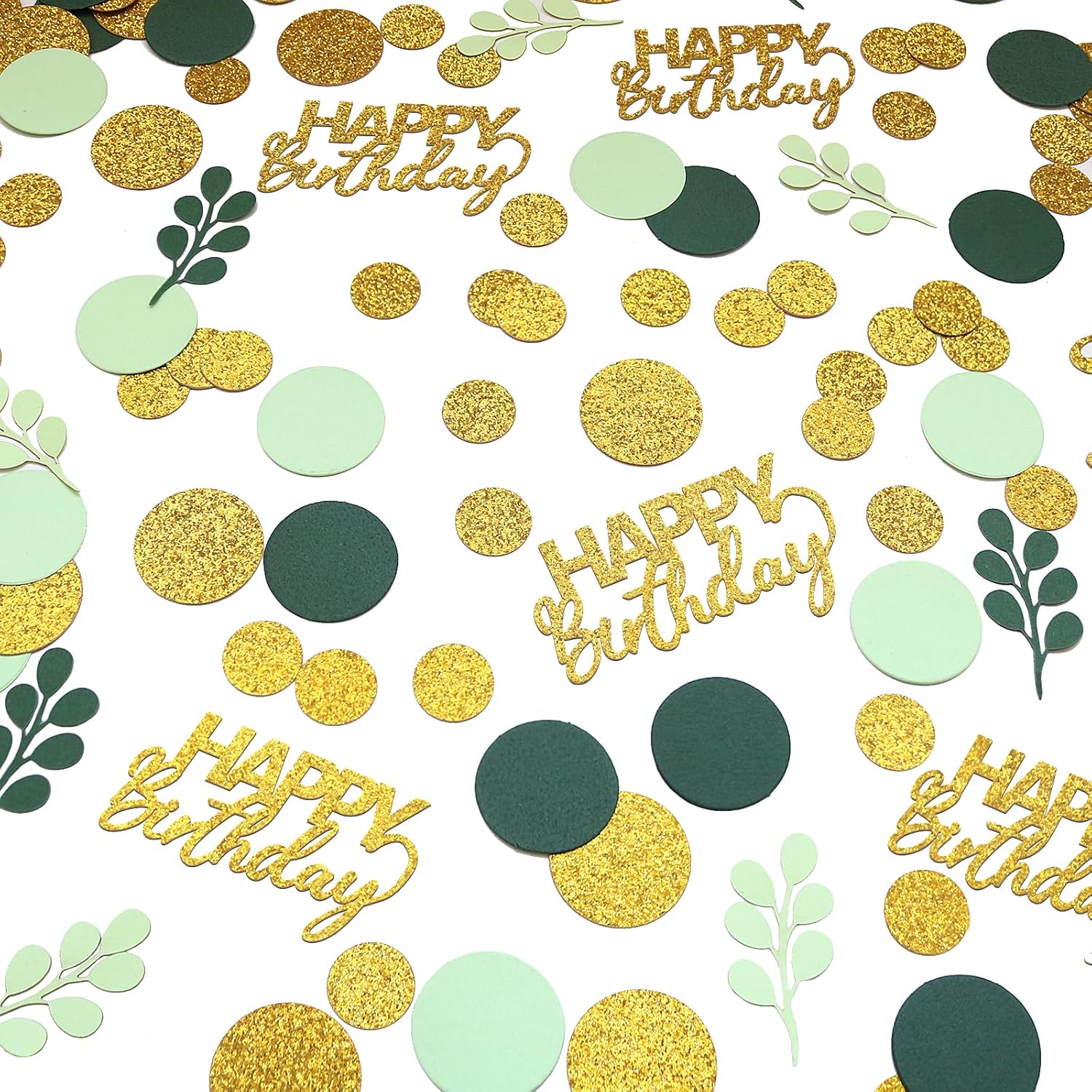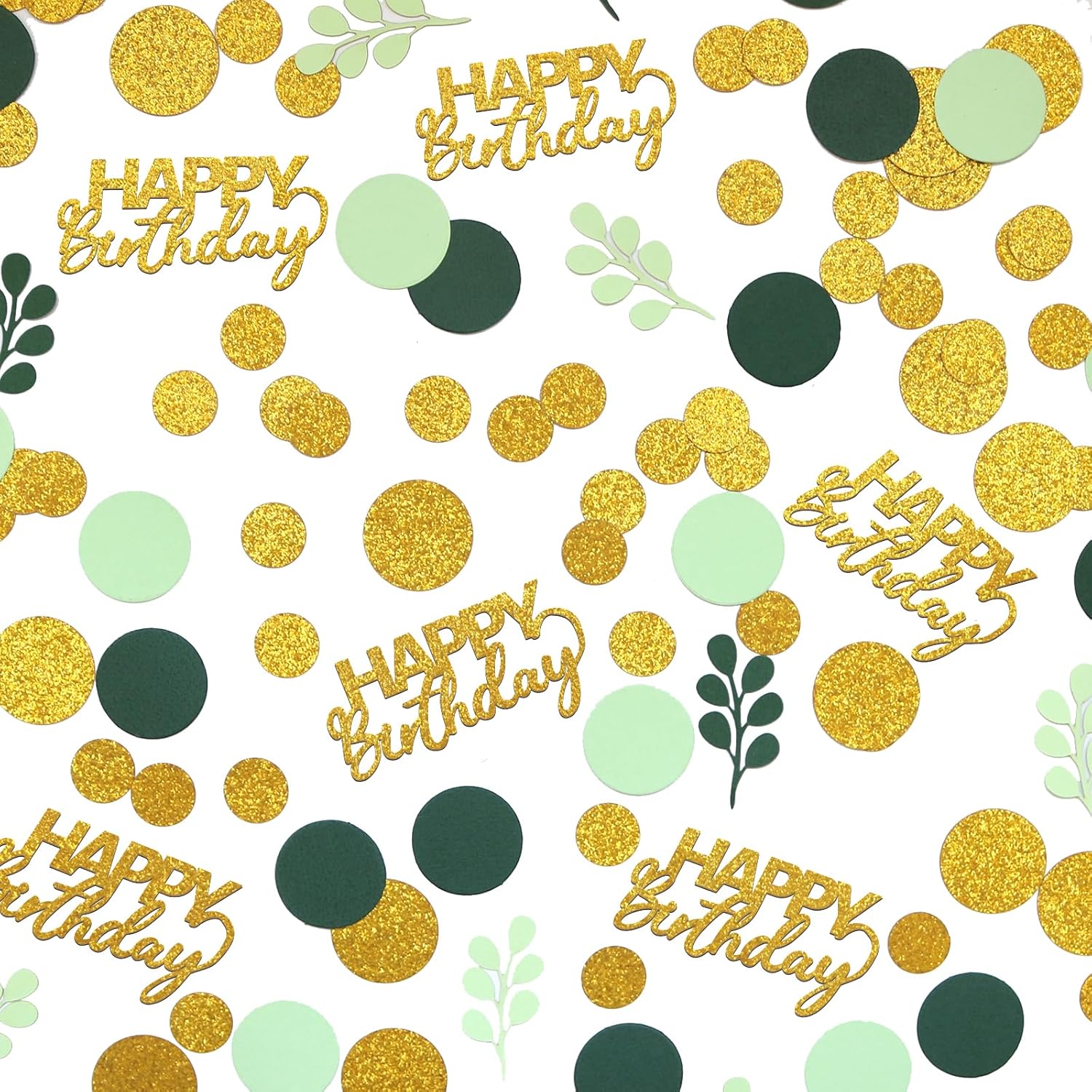 • 1.Great Addition to Your Birthday Party.The green and gold circle dots with happy birthday letter confetti scatter are shiny and fresh,very sparkle,a perfect addition to any age birthday party,from baby kids to adults,from girl boy to men women,nice green birthday decorations.