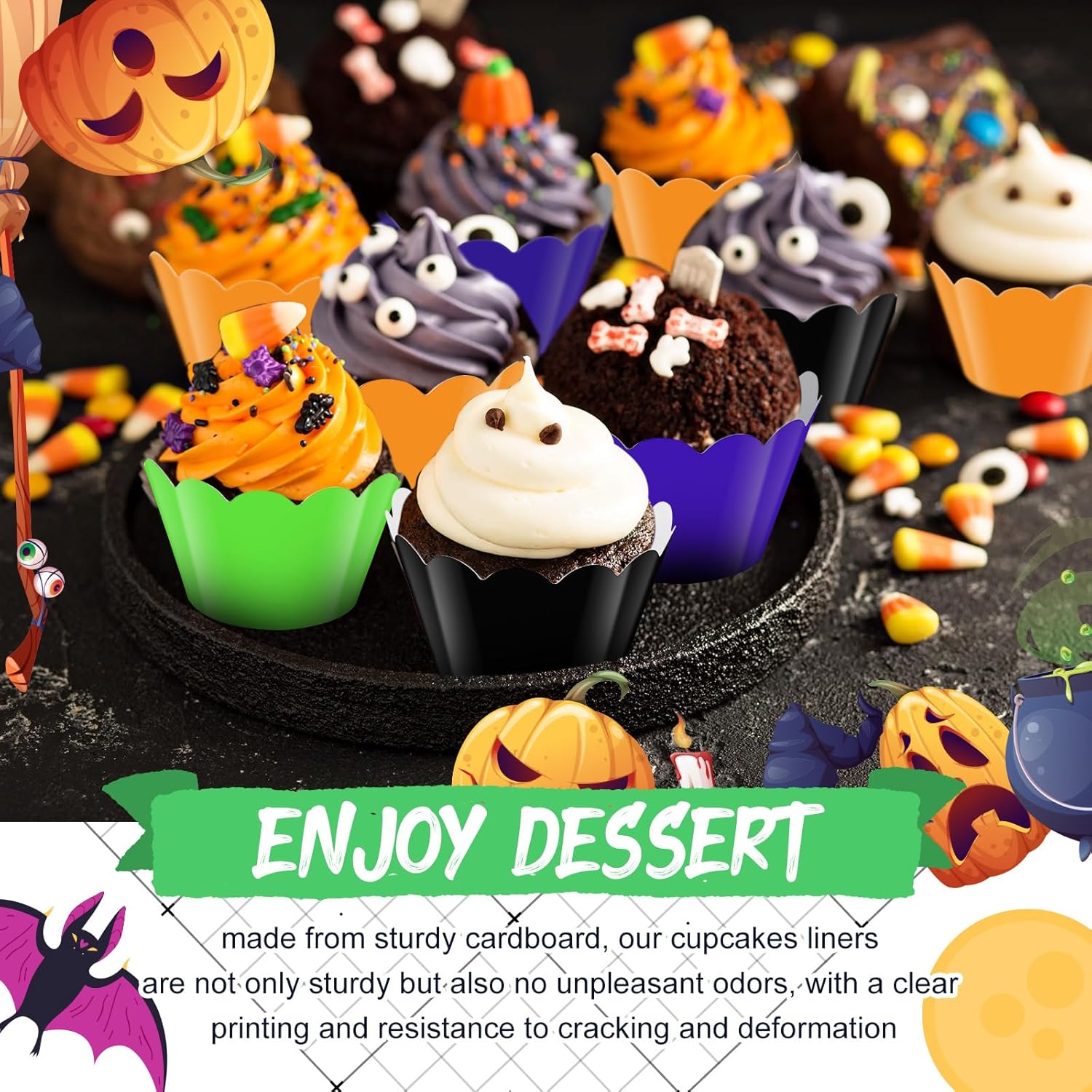 Domensi 100 Pcs Halloween Cupcake Wrappers Rustic Cupcake Liners Orange Black Purple Green Baking Cups Baking Liners for Wedding Bridal Baby Shower Birthday Halloween Party Supplies Dessert Decoration