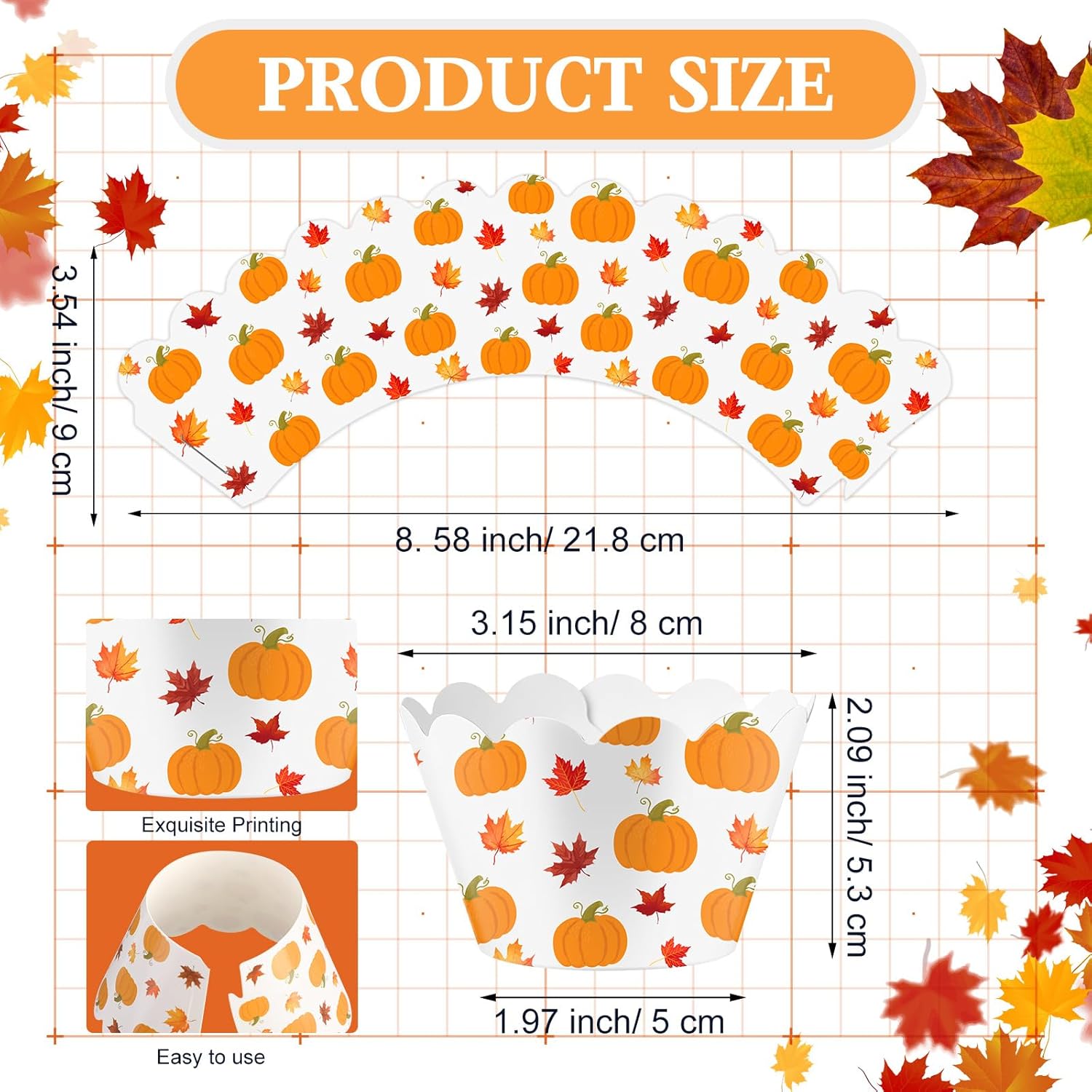 Domensi 100 Pcs Fall Pumpkin Maple Leaf Cupcake Wrappers Rustic Cupcake Liners Thanksgiving Baking Cups Baking Liners for Autumn Wedding Bridal Baby Shower Birthday Party Supplies Dessert Decoration