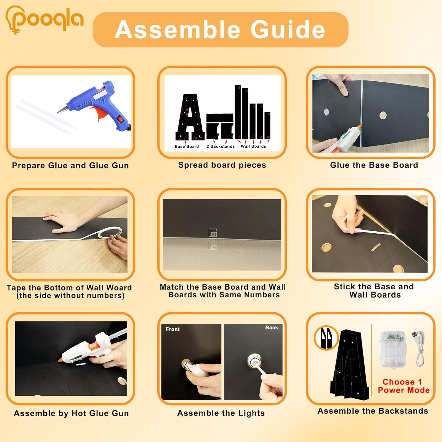 • Easy to Assemble: 1) Glue the base board, match the base and wall boards according to marked number and arrow. 2) Glue the base and wall boards together. 3) Screw the bulbs, connect LED lights and power on. Note: Glue gun, glue not included