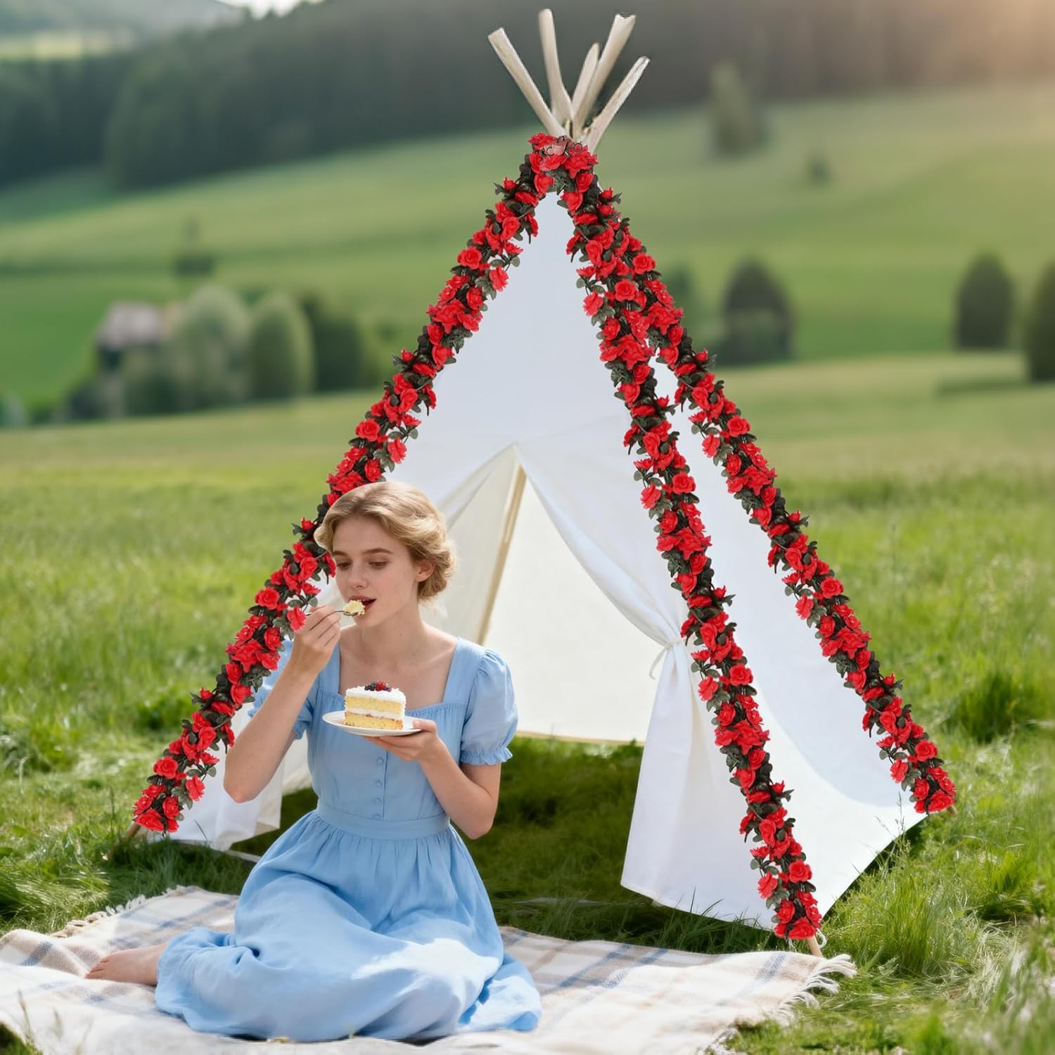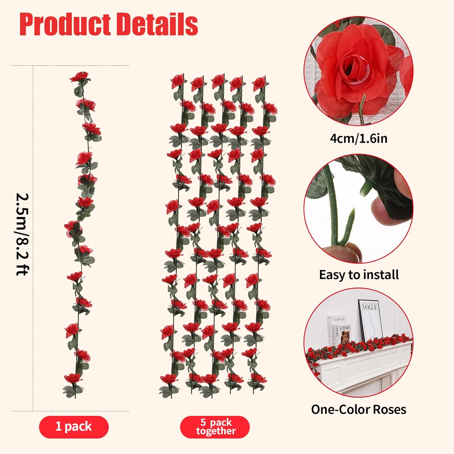 • PACKAGING: Total length 41FT, each vine 8.2FT (250CM), 5 vine plants hanging fake flower garland. Each plant has 45 flowers. Rose heads are 1.6” (4CM) in diameter. 45 leaves. These 5 rose vines are fluffy enough to decorate your room!
