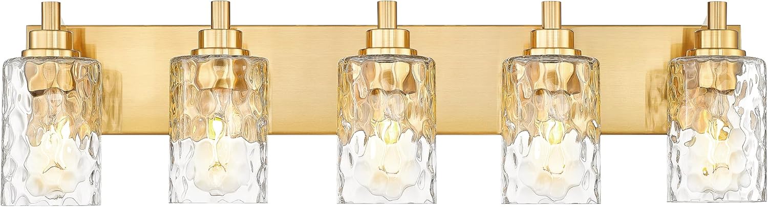• Inspired Design: The 5-light bathroom vanity light feature a combination of clear hammered glass cylinder shades and a brushed gold metal long base back plate, creating a fusion of timeless elegance and modern minimalism. The bathroom lighting fixtures over mirror are sure to add a touch of unique charm and ambiance to your space