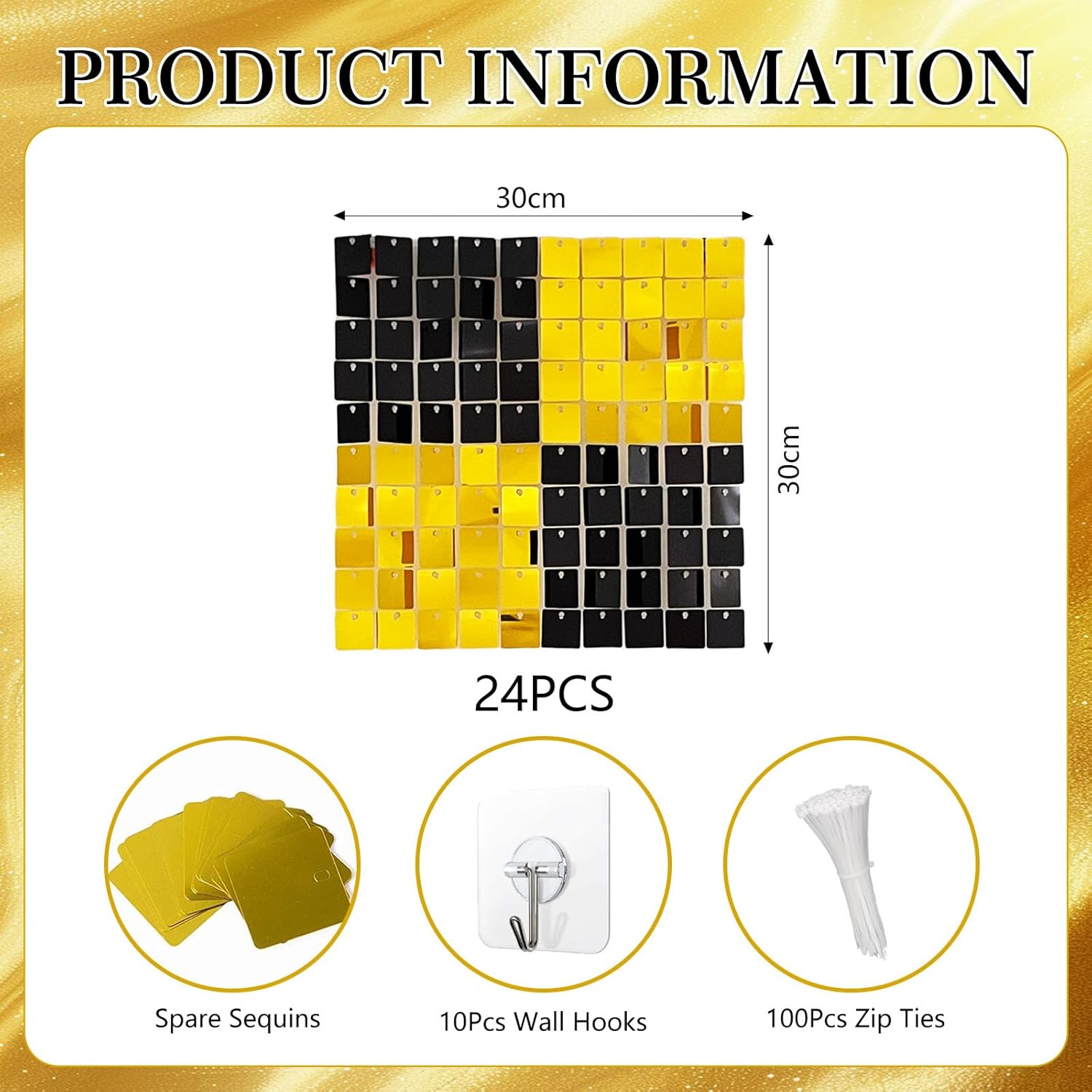 24PCS Black Gold Shimmer Wall Backdrop, Square Sequin Photo Backdrops Panel, Glitter Wall Background for Birthdays, Weddings, Christmas, Engagements, New Years Party Decor (4FTx6FT)