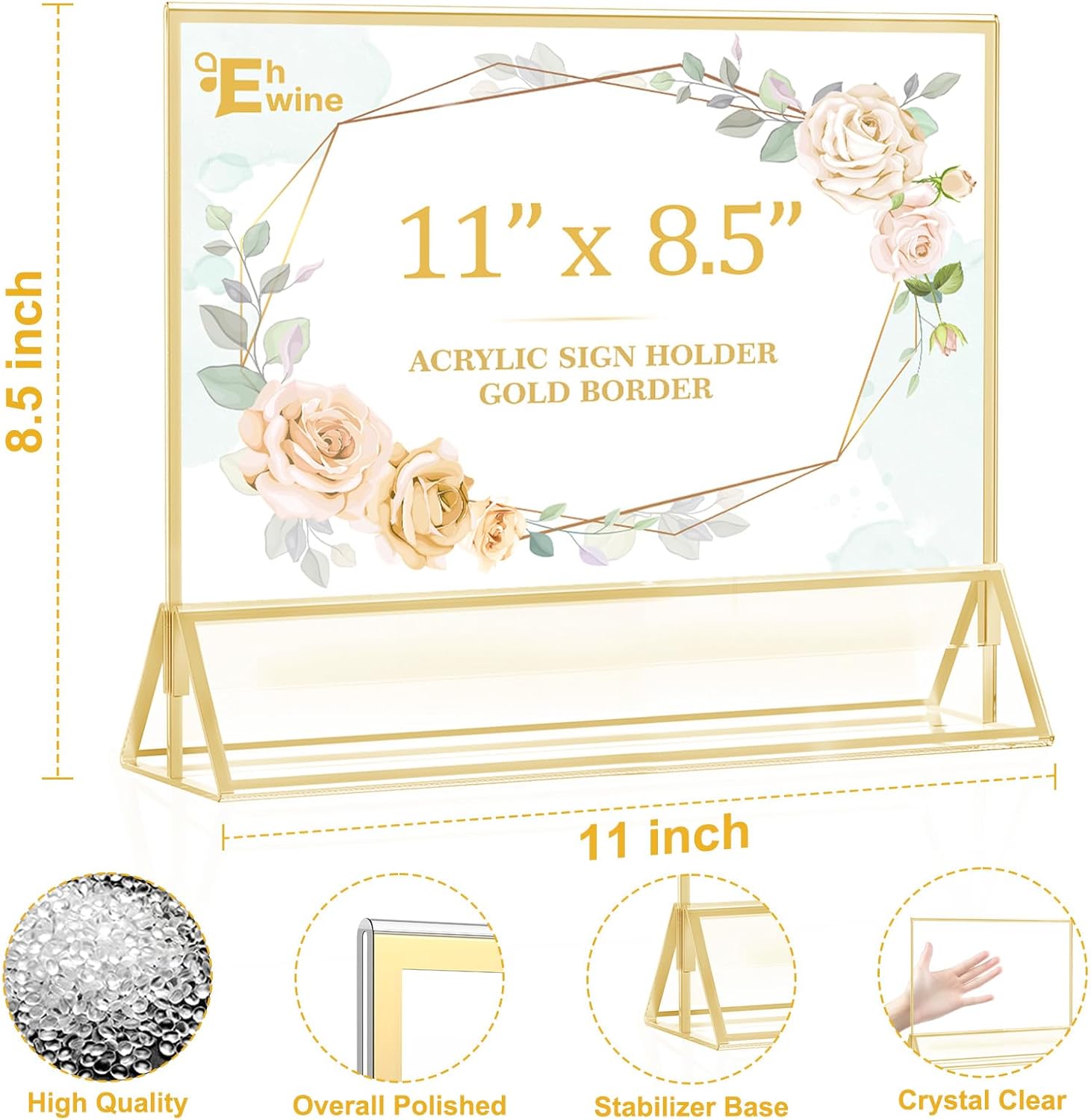 • Clear Golden Border Picture Frame: EHWINE acrylic sign holders are incredibly clear and transparent, providing a professional look to your displays. With no distortion or cloudiness, your message will be conveyed with crystal-clear clarity