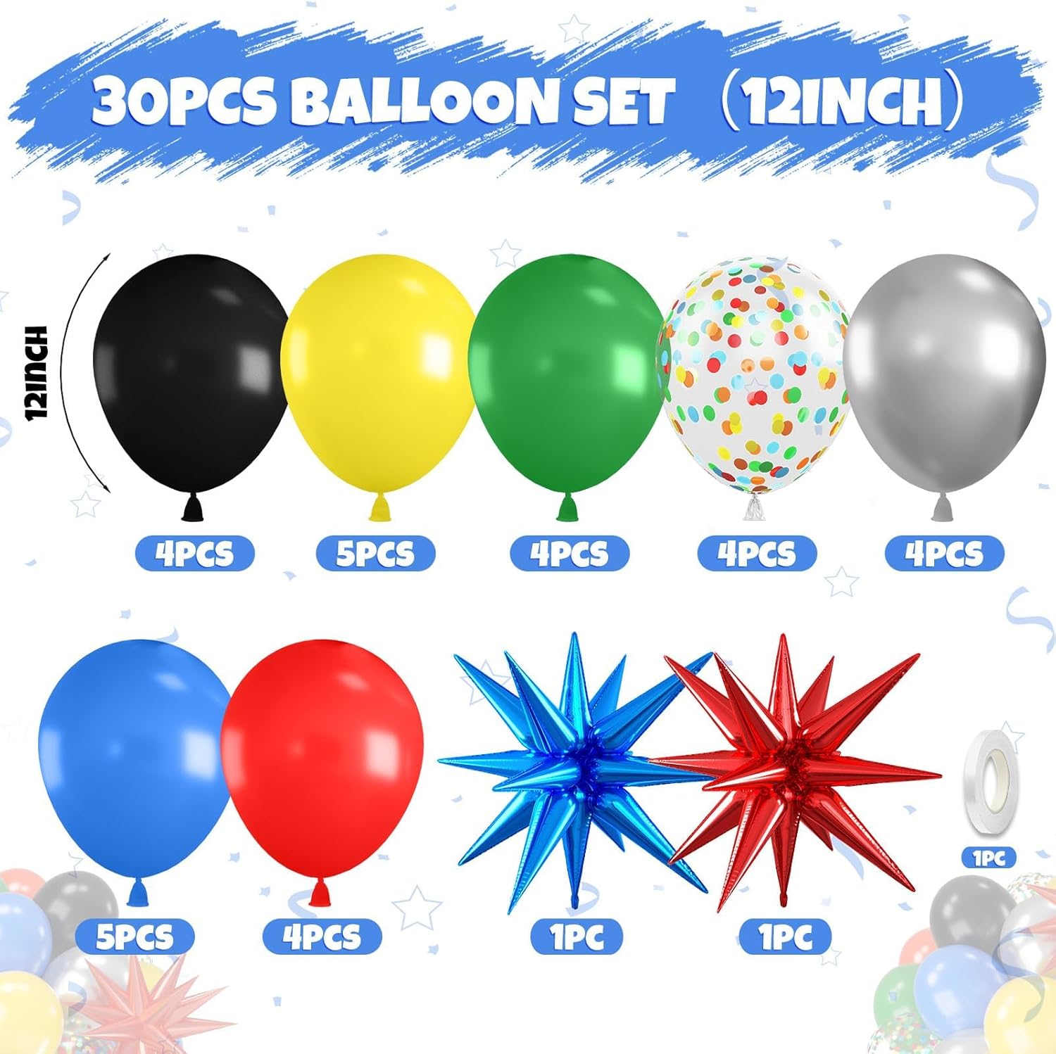 • 【12 Inch Black and Red Yellow Blue Balloons】This 30Pcs latex party balloons set includes:black balloons (4 pcs),yellow balloons (5 pcs),dark green balloons (4 pcs),metallic silver balloons(4 pcs),dark blue balloons(5 pcs), red balloons(4 pcs), colorful confetti balloons(4 pcs), 2pc star foil balloons(red*1,dark blue*1), white balloon ribbon (1 roll). Suitable for decorating various occasions, such as kids boys party birthday baby shower anniversary graduation.