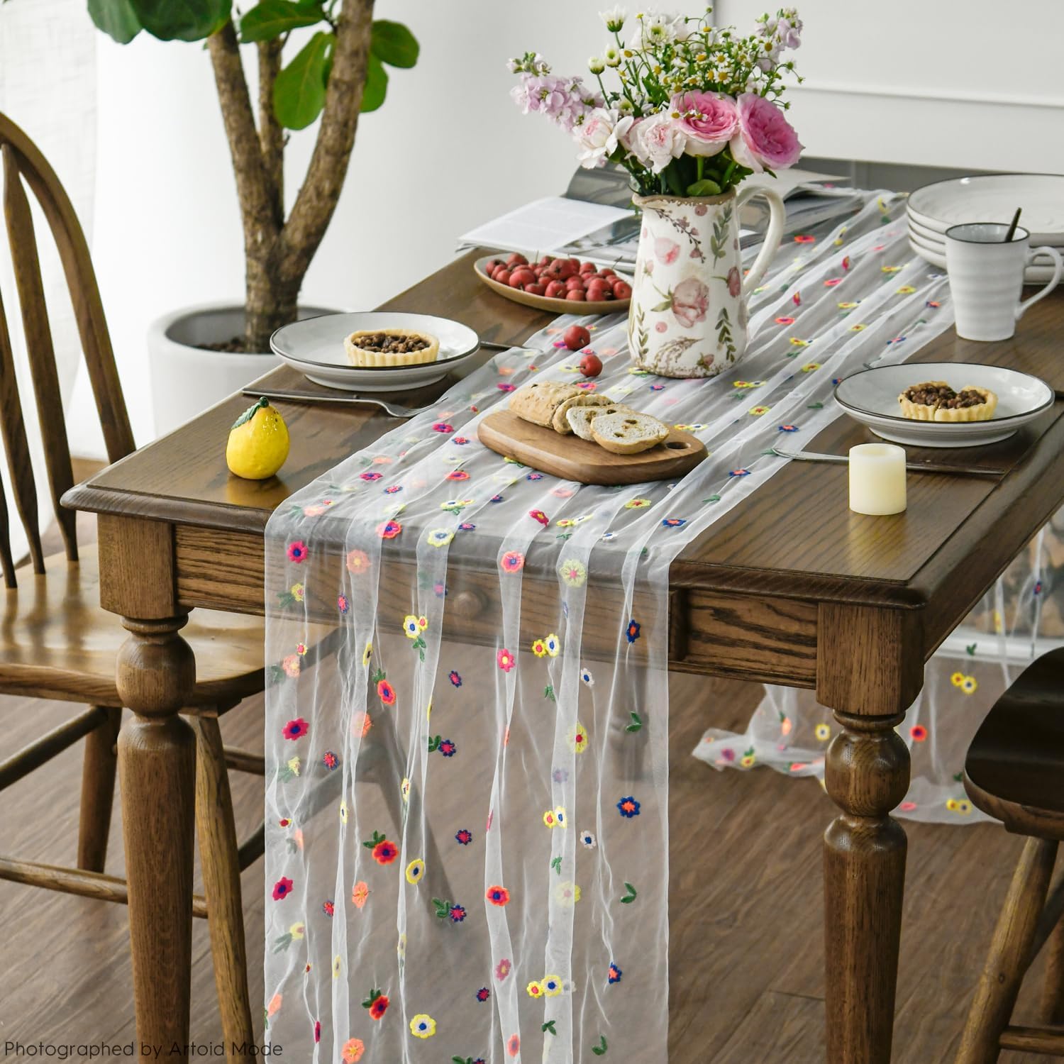 Artoid Mode 6PCS Embroidery Daisy Gauze Table Runner 120 Inch 10FT, Seasonal Sheer Kitchen Dining Holiday Wedding Birthday Table Decor for Home Party