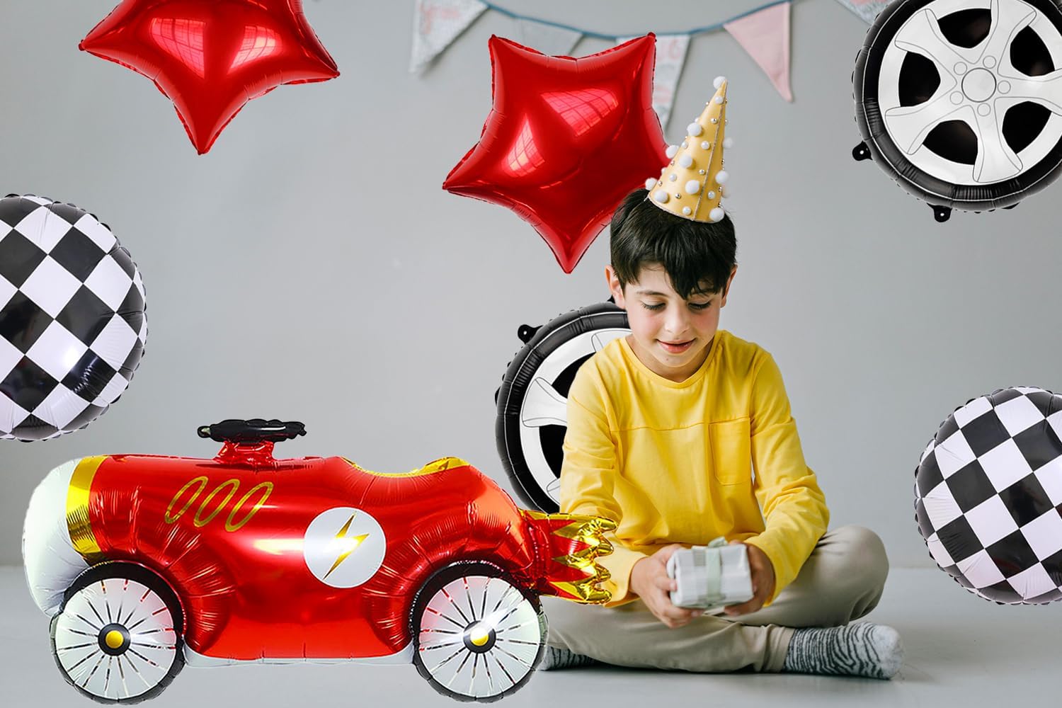 7 Pcs Vintage Race Car Balloon Set,Black and White Checkered Car Wheel Red Star Foil Helium Balloon,Racing Theme Birthday Party Baby Shower Decorations Supplies