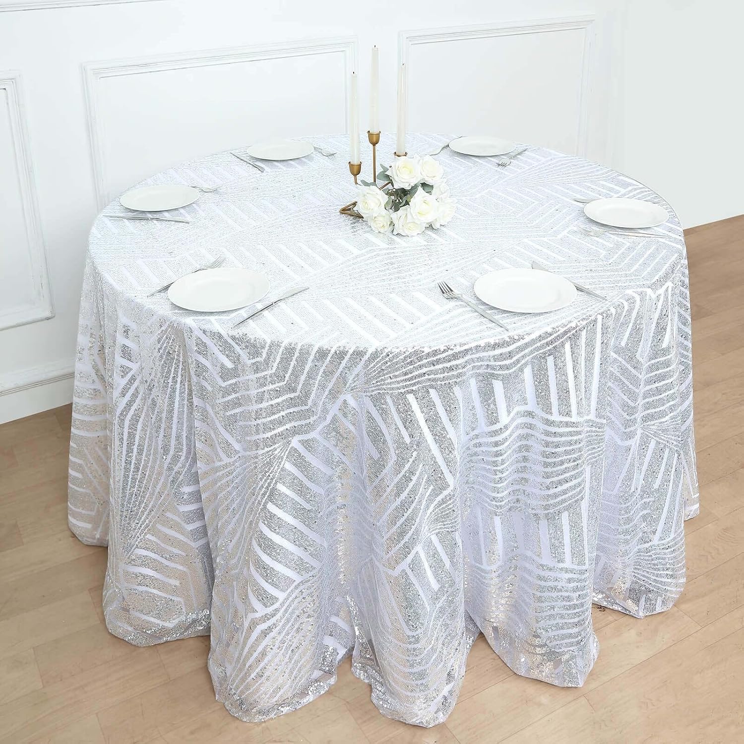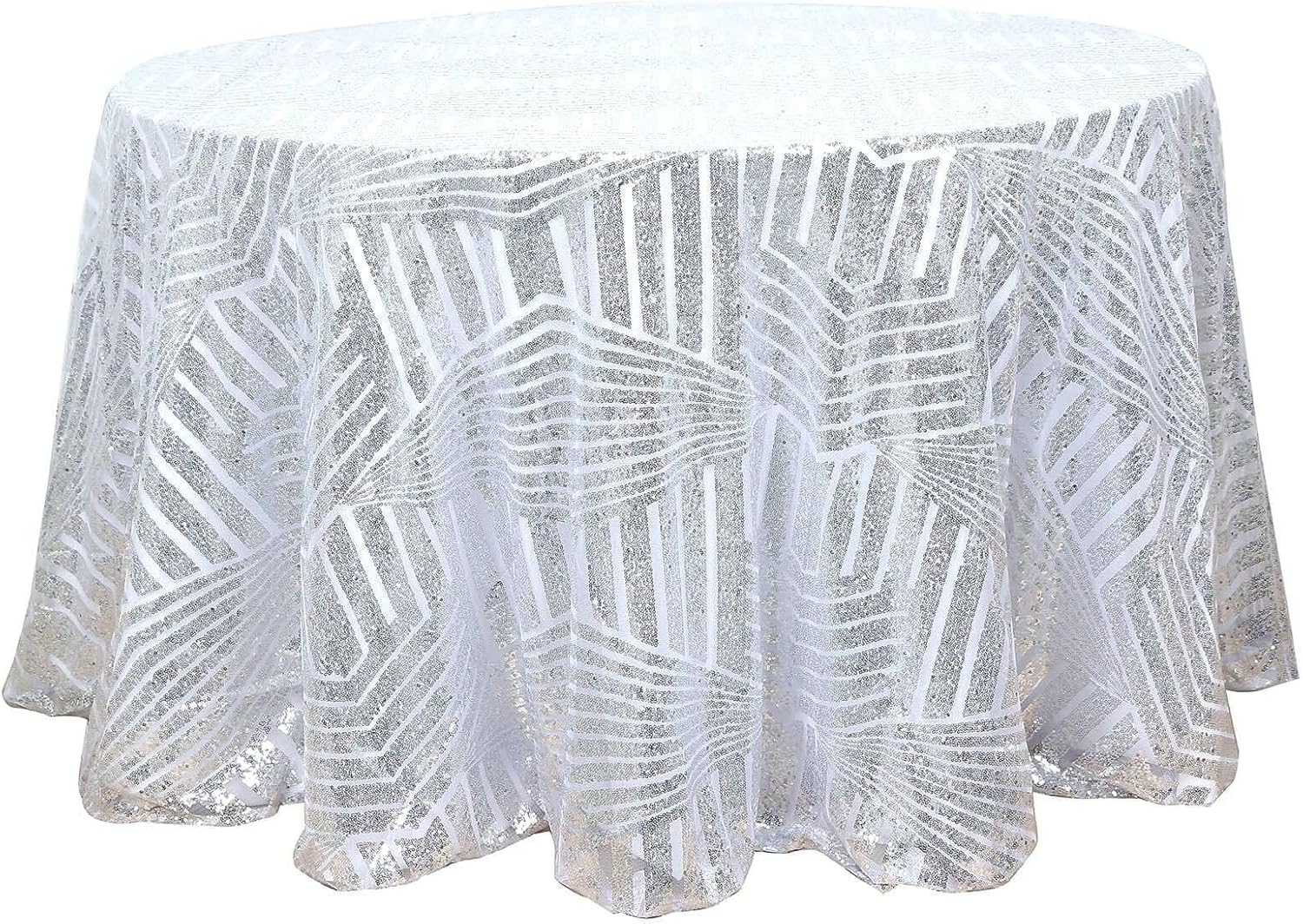 • Quantity: 1 Round Tablecloth Material: Shiny Sequin Beads atop Tulle Net Fabric Color: Silver Style: Geometric Lines Pattern Size: 120" Edges: Hemmed Seamless 1pc Design Gives floor length hang on 5ft (60") round tables