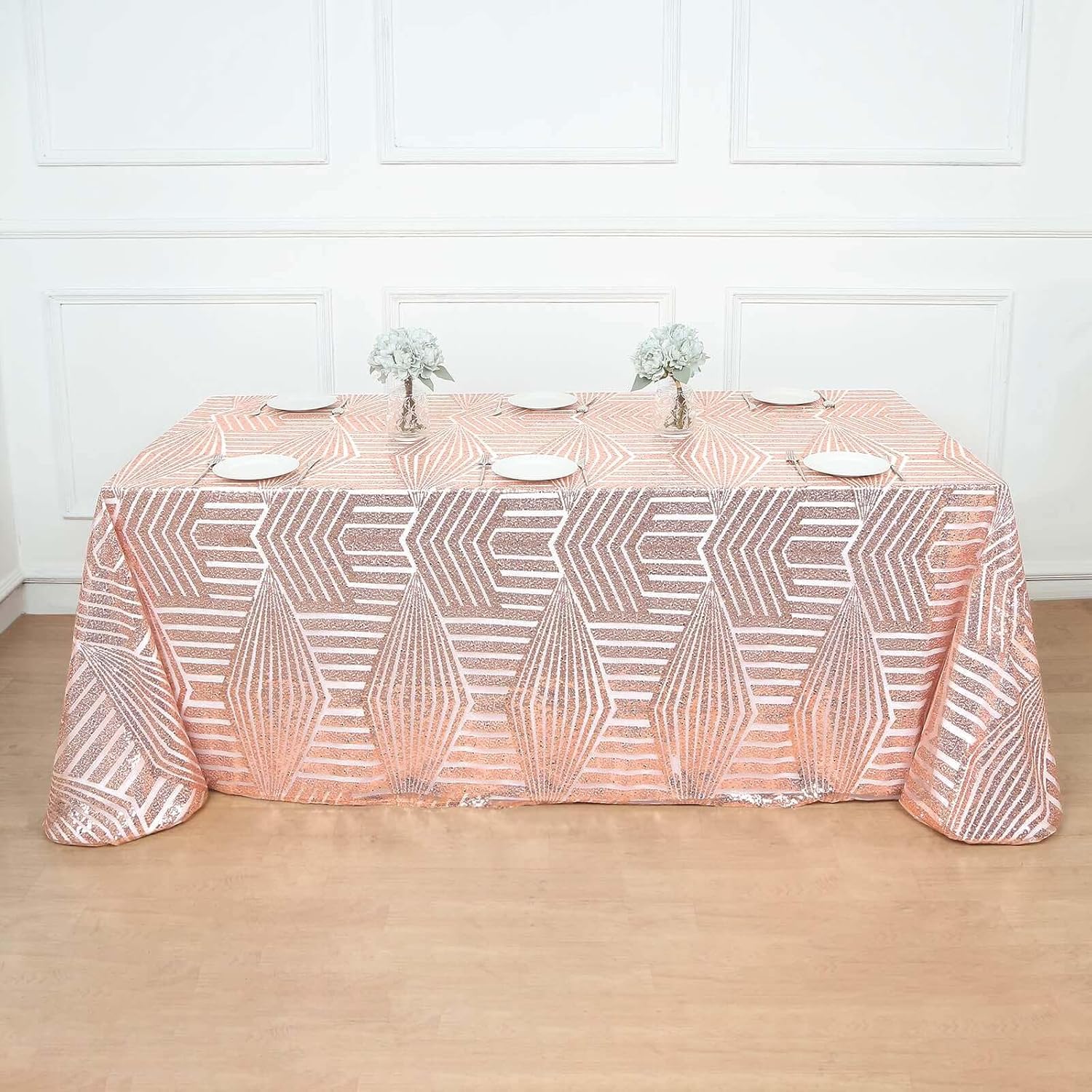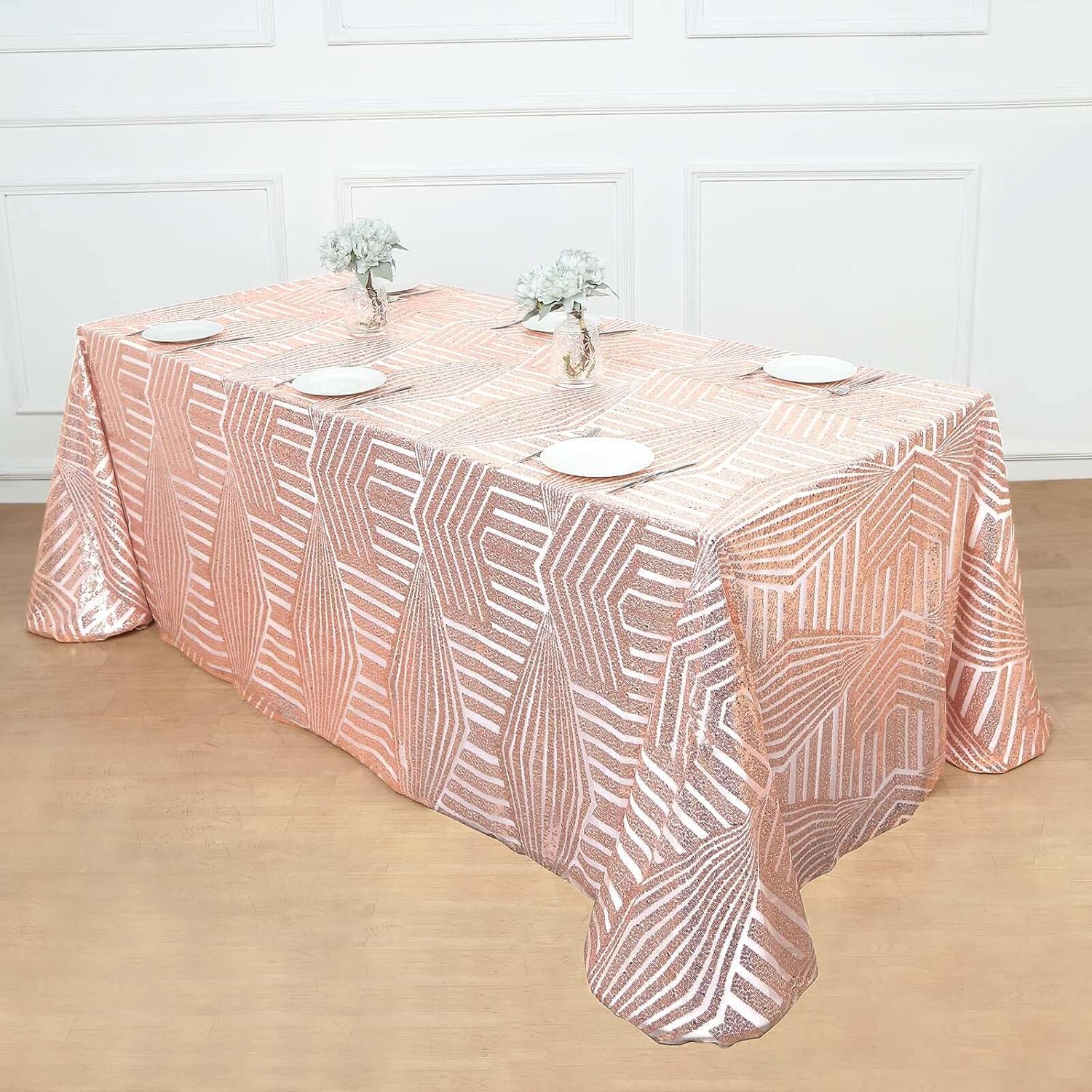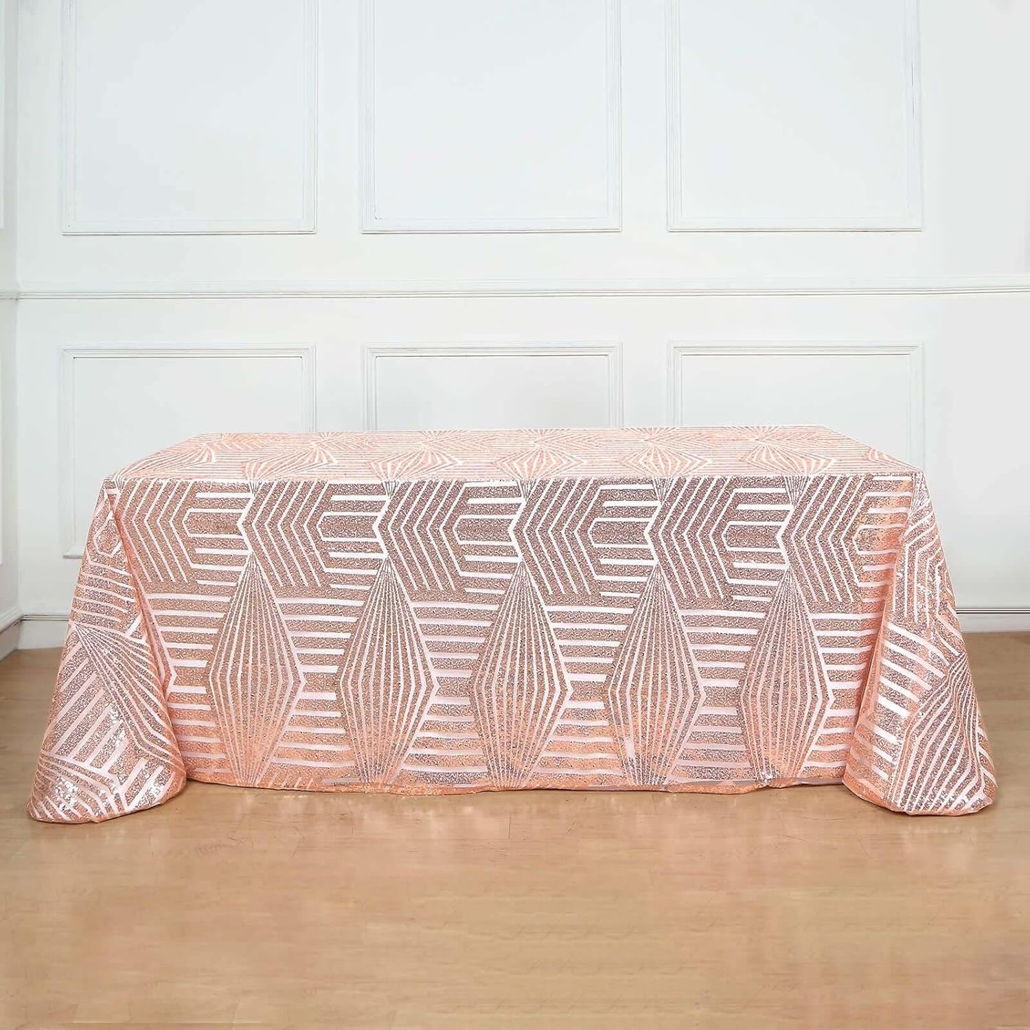 Efavormart 90"X132" Blush Rose Gold Sparkly Sequin Geometric Tulle Rectangular Tablecloth