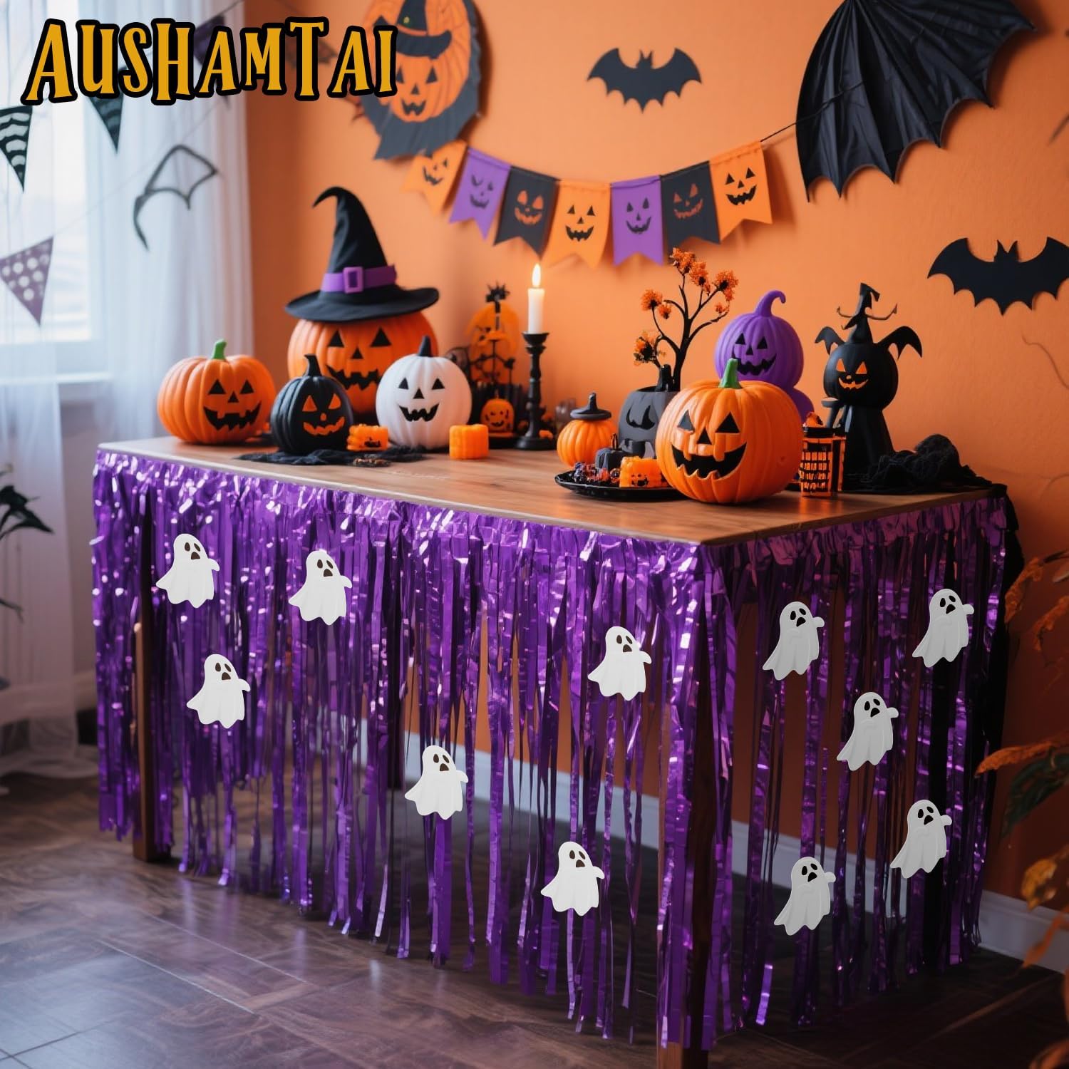 • Multi-color options: the purple table cover with ghost decorations is shiny and bright. The foil fringe table skirts provide a variety of color options, to meet different halloween atmosphere needs. The purple table cloth adds a mysterious touch to halloween.