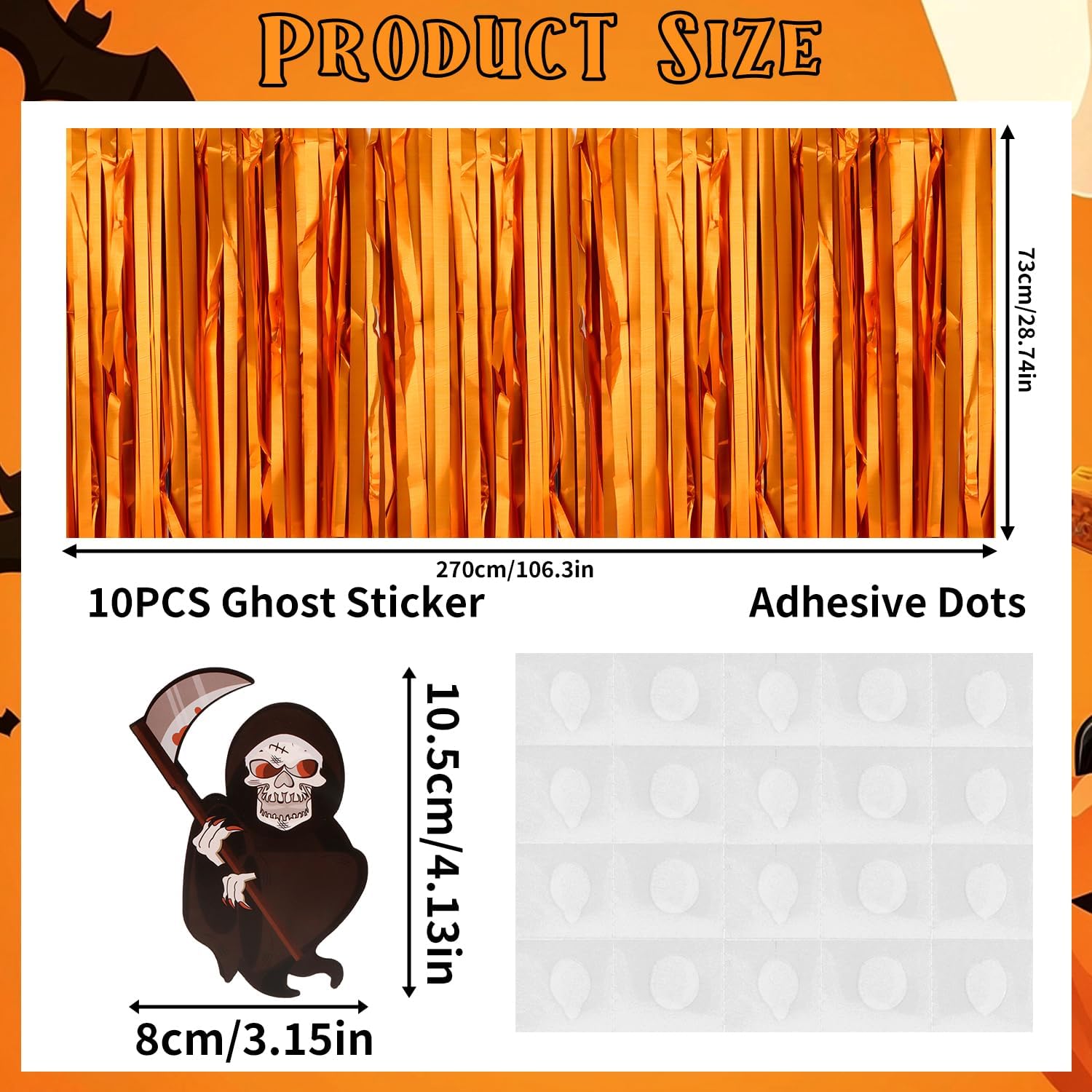 • The packaging includes: 1 pack metallic foil tassel table cover 28.74x106.3 inches, which is enough to decorate your halloween party, provide you with excellent convenient installation: the halloween table cloth is equipped with self-adhesive tape. Just tear off the tape and paste it. There are ten skull stickers, 3.15x4.13 inches, and adhesive dots provided in the package for sticking the stickers onto the halloween tablecloth. The installation is convenient and quick. It can be pasted on the edge of your round table or rectangular table. It can be easily cut into any siz.