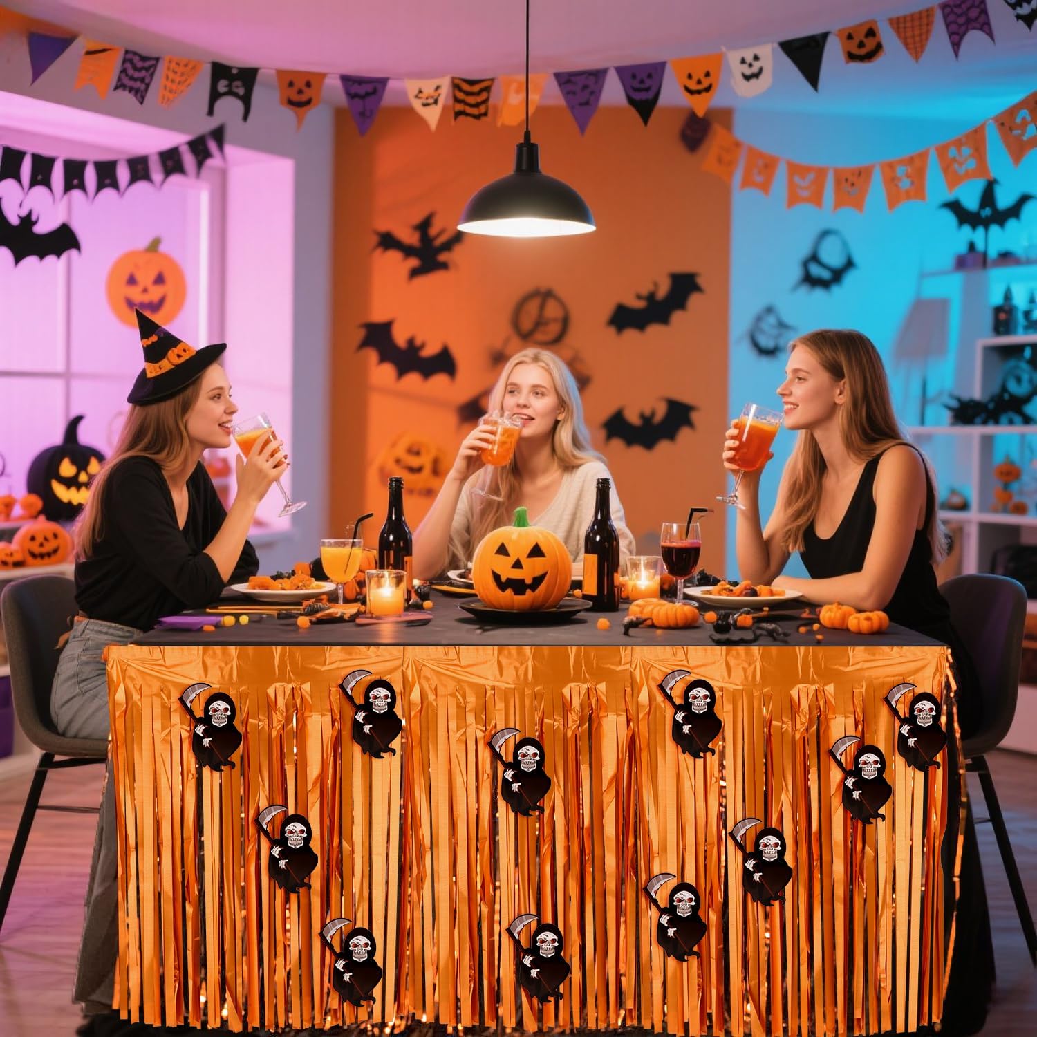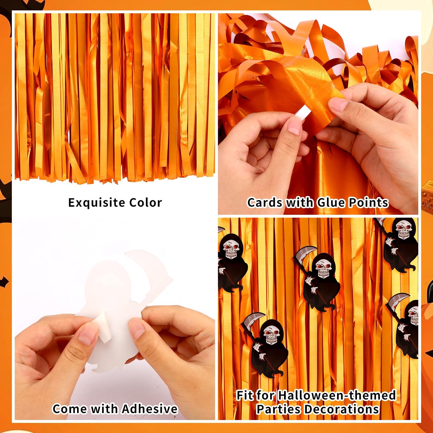 • Use tips: you can cut the foil fringe orange halloween streamers with scissors into the suitable length, assemble the party streamers side by side to make the scope larger. If you want to make your party table decorations look fuller and thicker, you can overlap two table skirts, also overlap sequin table cloth in different colors to create a beautiful party easily.