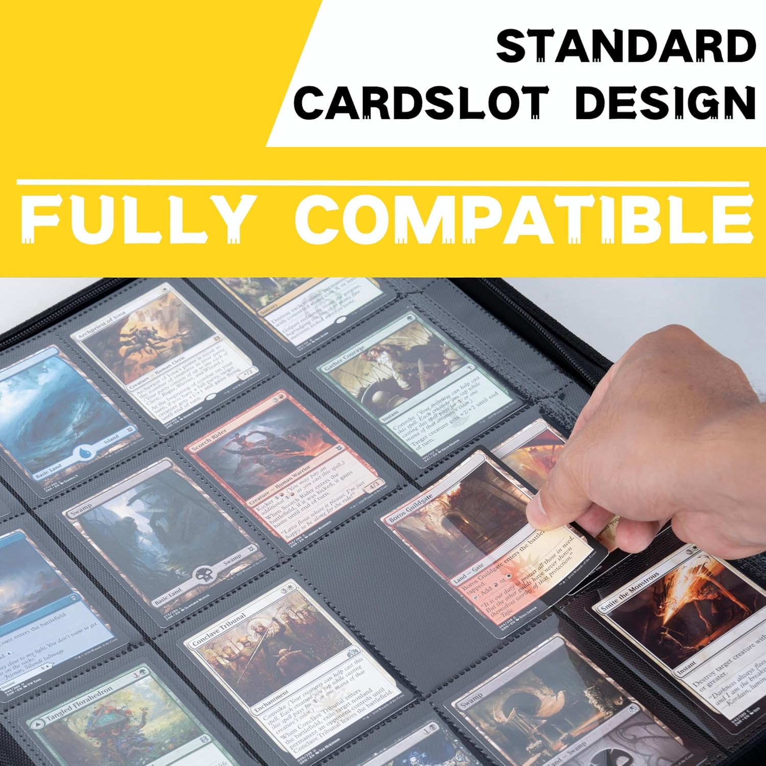 • ๐—ฆ๐˜๐—ฎ๐—ป๐—ฑ๐—ฎ๐—ฟ๐—ฑ ๐˜€๐—ถ๐˜‡๐—ฒ: Designed for standard-sized collector sleeves and binders, this trading card holder allows for easy organization and presentation of your collection's best pieces. No more struggling to fit oversized or undersized cards into holders that just aren't built for them!