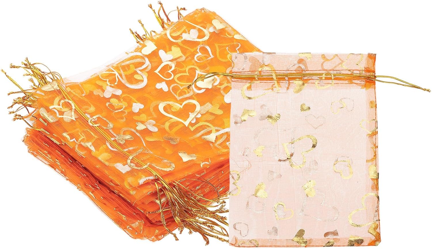 PATIKIL 100 Pcs 5x7 Inch Heart Printed Organza Bags, Orange Sheer Heart Organza Bags with Drawstring for Christmas Candy Jewelry Party Wedding Favor Gift