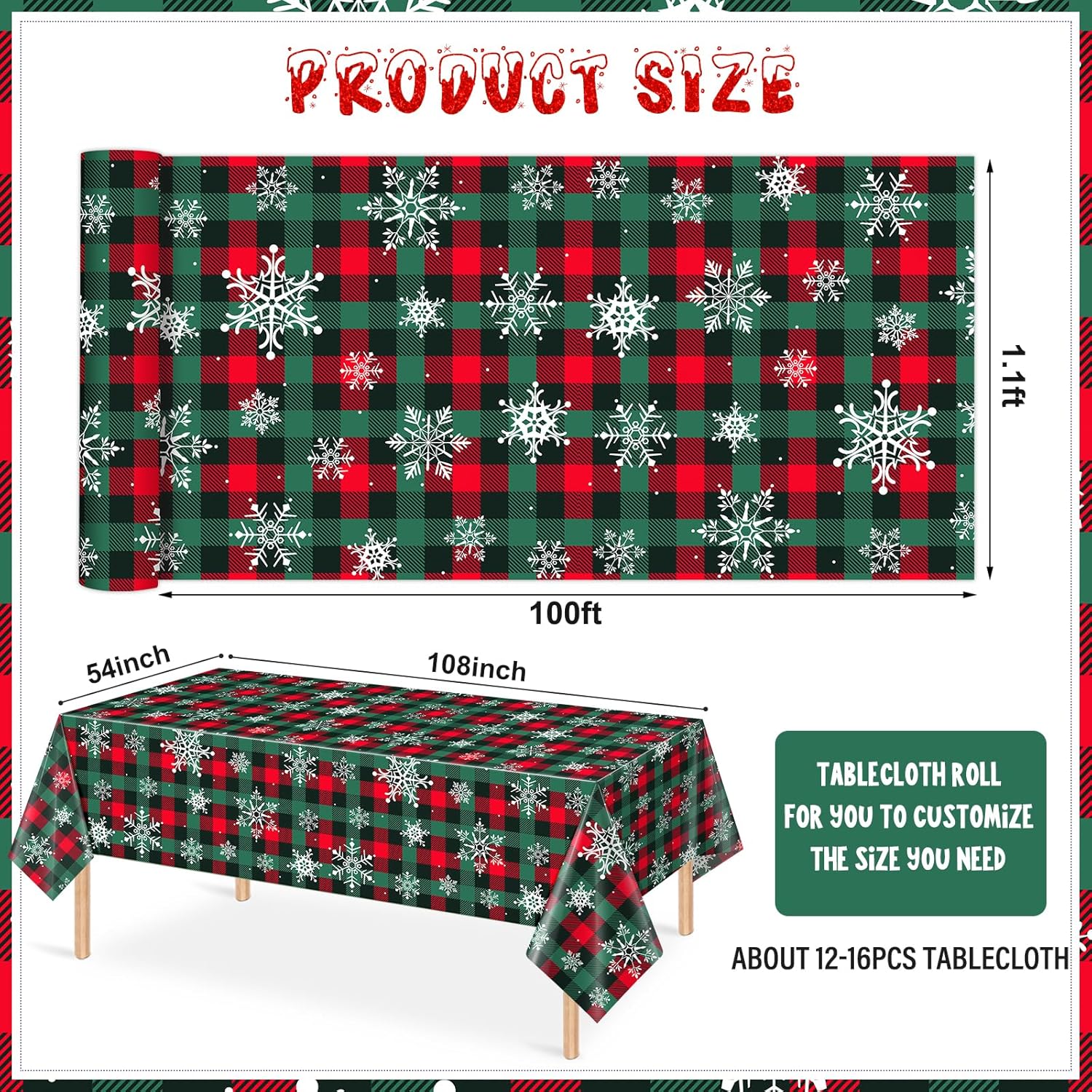 4.5x 100 Ft Roll of Christmas Buffalo Plaid Plastic Tablecloth Decorations,Disposable Red Green Snowflake Table Cover Photography Backdrop with Cutter Box for Christmas Holiday New Year Party Supplies