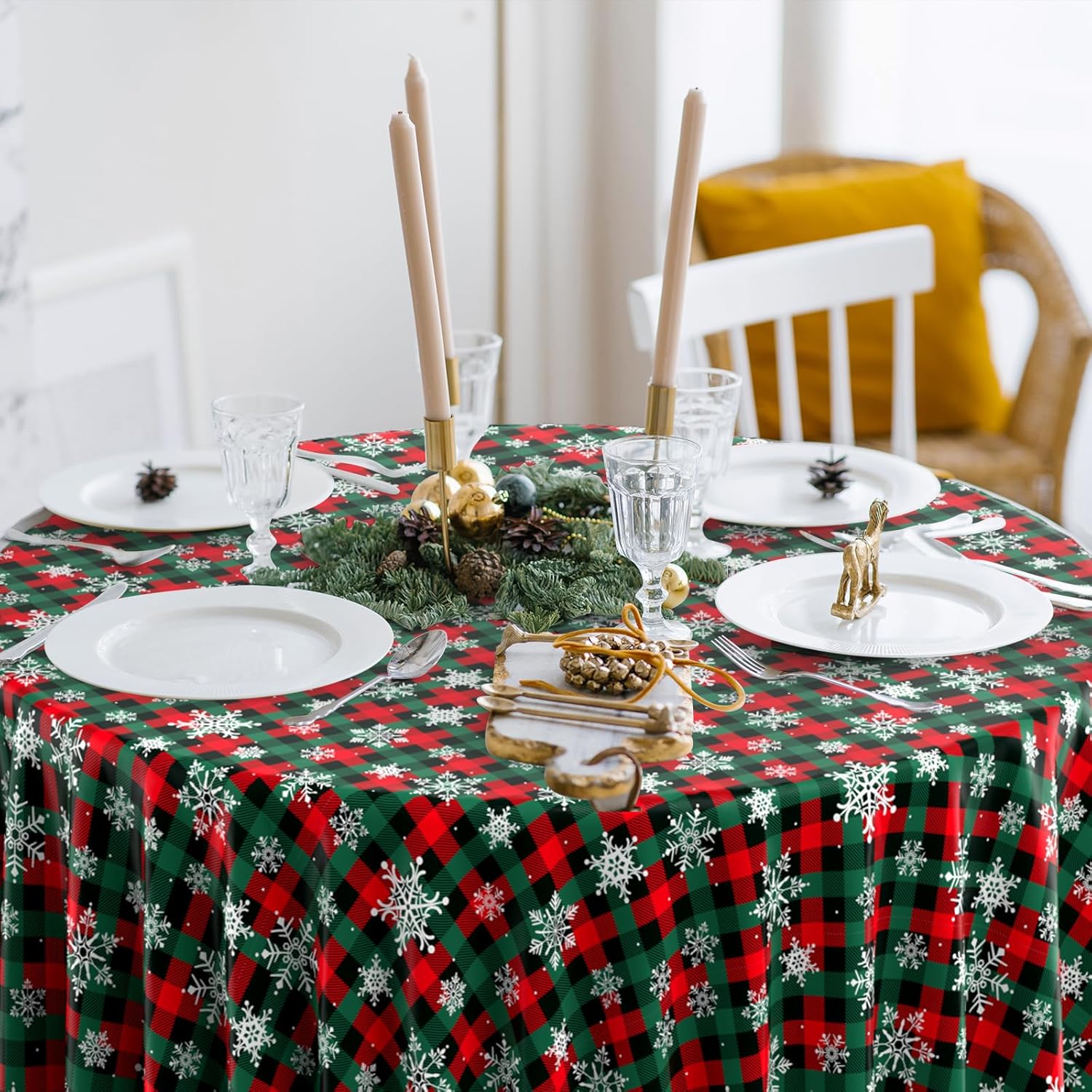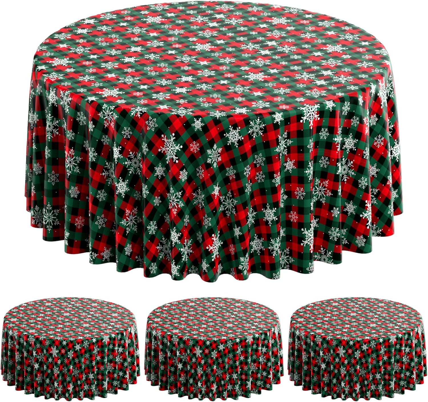 • What will you receive: 3 pieces round Christmas party tablecloth,all over printed with white snowflake patterns on red and green buffalo plaid background,ideal for decorating your winter holiday and Christmas party supplies and decorations