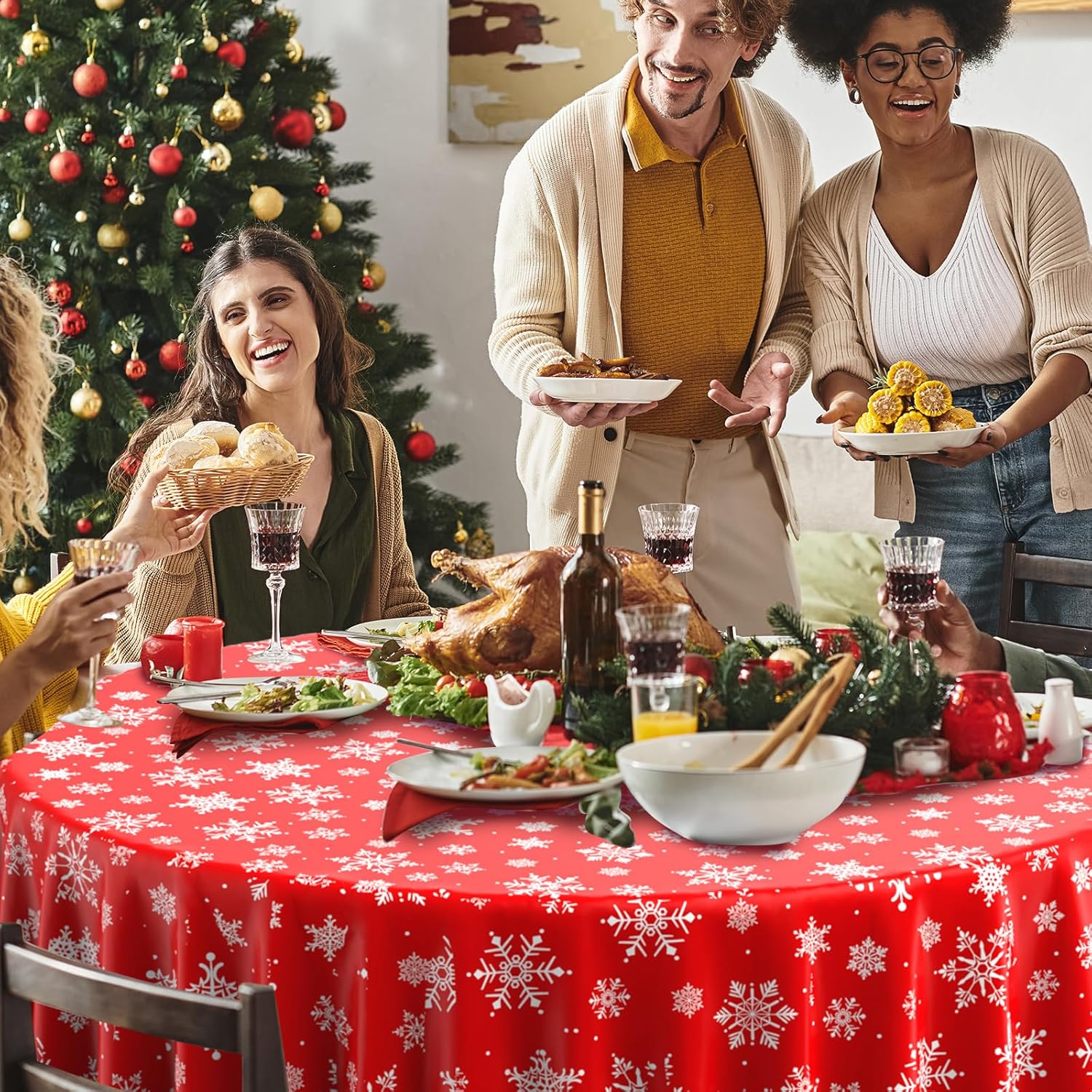 • Extra large size: these red snowflake Christmas party tablecloth measures approx. 84 inch, which fits for various-sized tables that can accommodate 8-10 people, It’s large enough for your to hold a winter holiday and Christmas theme party with your family and friends to share happiness