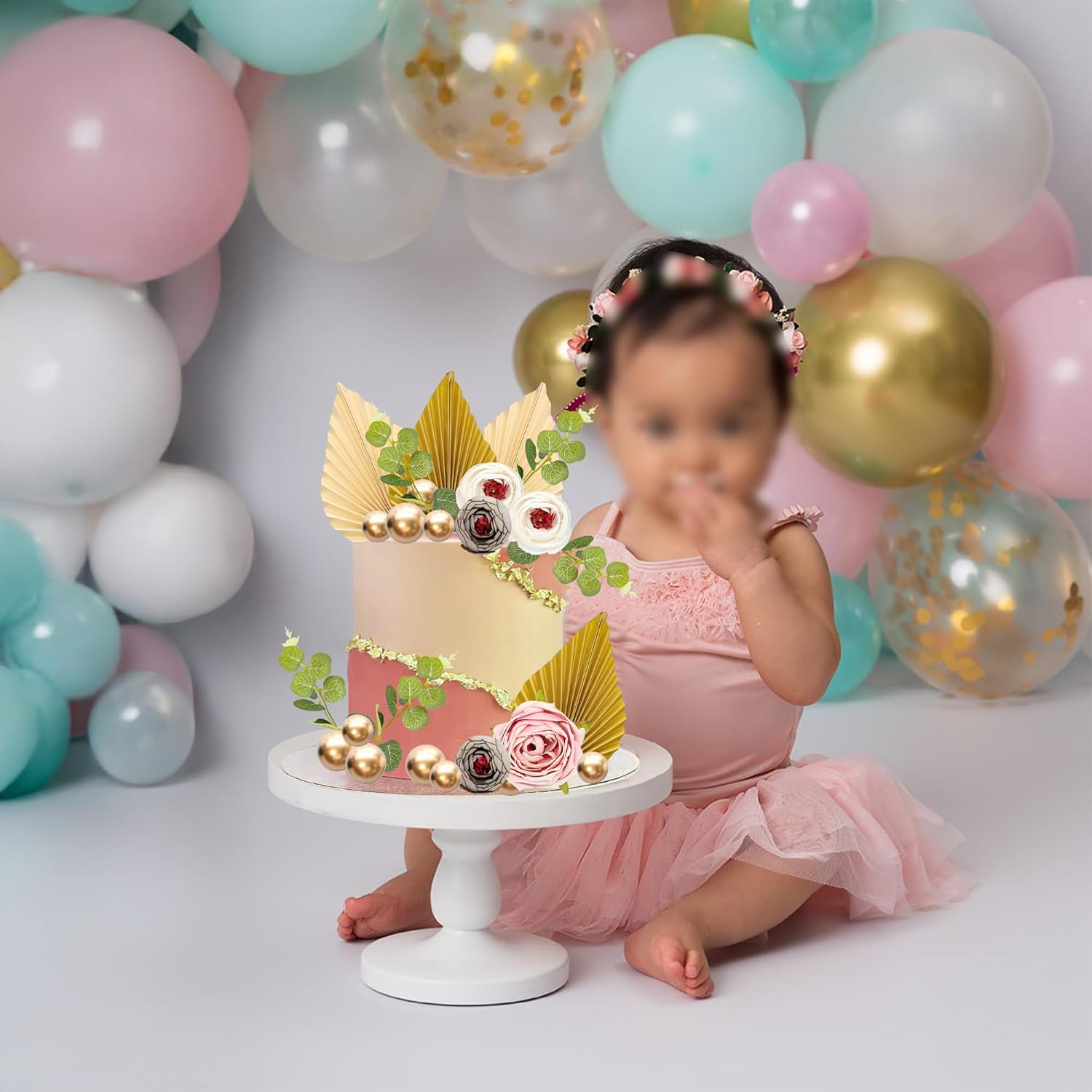 Gyufise 22Pcs Rose Artificial Flower Leaves Cake Topper Decorations Gold Balloon Cake Toppers Leaf Paper Palm Fan Cake Picks for DIY Wedding Birthday Valentine's Day Party Decorations Supplies Beige