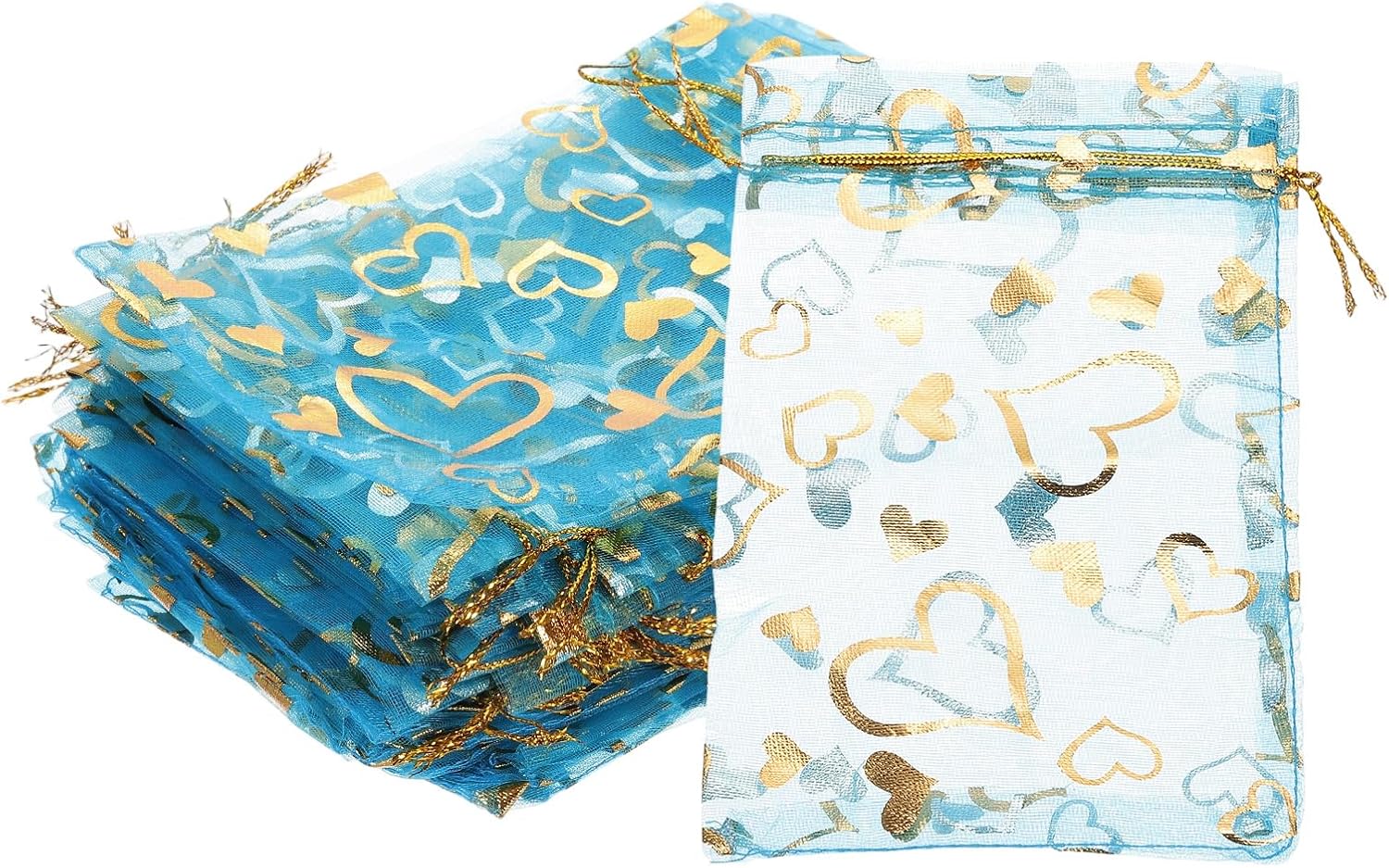 • Color: Lake Blue; Material: Polyester; Size: 16x11 cm/6.3x4.33 Inch(L*W); Packing List: 100 Pcs x Heart Printed Organza Bags (NOTE: Please confirm the size before choosing our product)