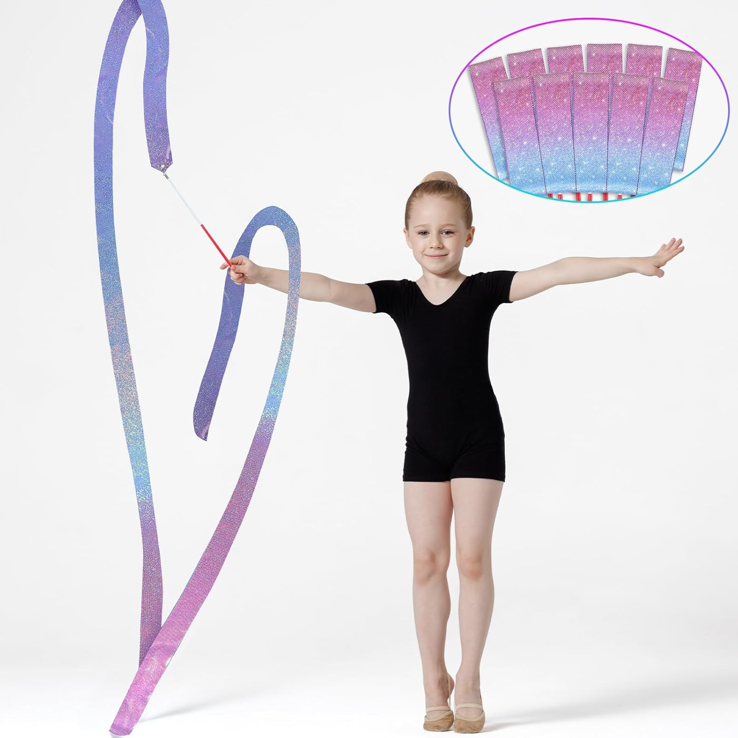 • Quality material: The sparkly dance ribbon for kids is crafted from high-quality satin and glass fiber, making it durable, sturdy, and tear-resistant. Kids twirling streamer is designed to resist fading, while the non-slip handle offers a comfortable grip. The twirling baton allows for smooth and flexible ribbon movement.