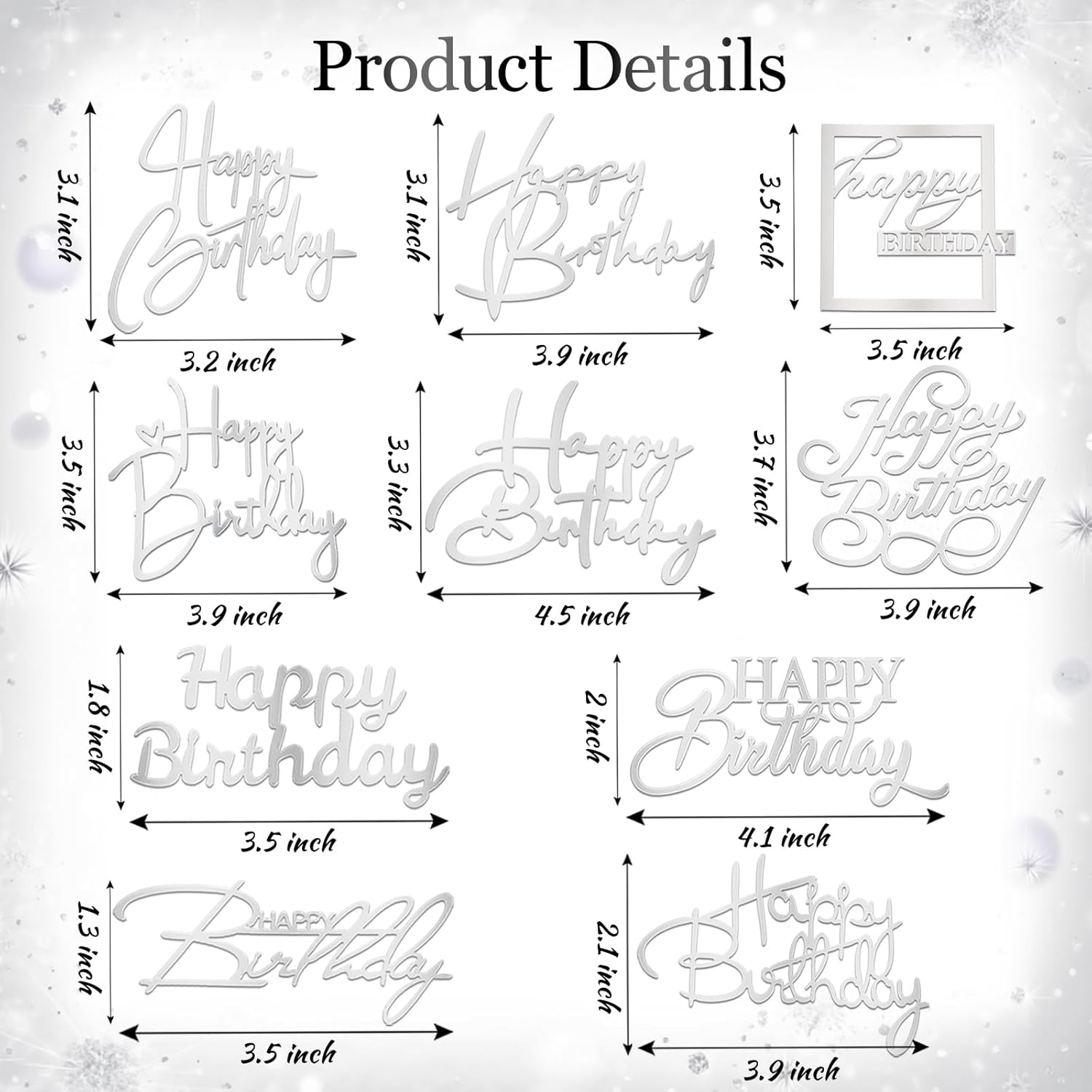 10 PCS Silver Happy Birthday Cake Topper Mirror Acrylic Cake Toppers Double-Sided Glitter Birthday Decorations for Girls Women's Party Supplies